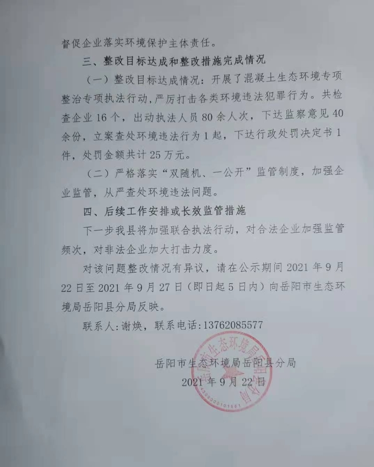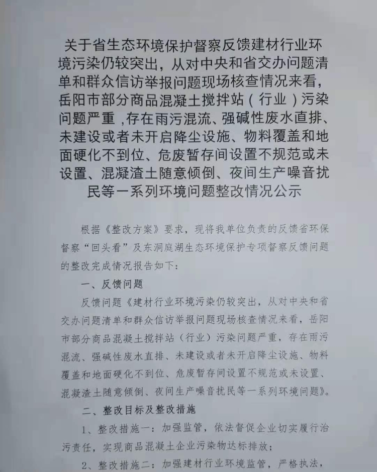 關於省生態環境保護督察反饋建材行業環境汙染仍較突出,從對中央和省交辦問題清單和群眾信訪舉報問題現場核查情況來看,嶽陽市部分商品混凝土攪拌站(行業)汙染問題嚴重等環境問題整改情況公示