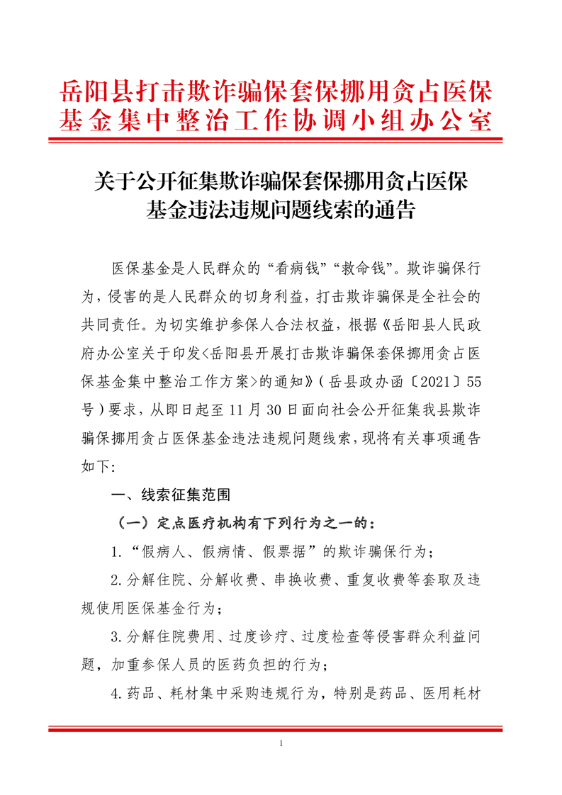 關於公開征集欺詐騙保套保挪用貪占醫保基金違法違規問題線索的通告