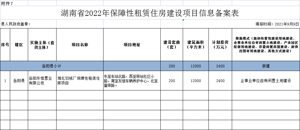 嶽陽縣2022年保障性租賃住房建設項目信息備案表