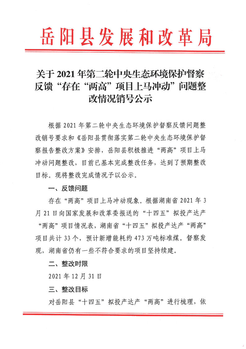 關於2021年第二輪中央生態環境保護督察反饋“存在“兩高”項目上馬衝動”問題整改情況銷號公示