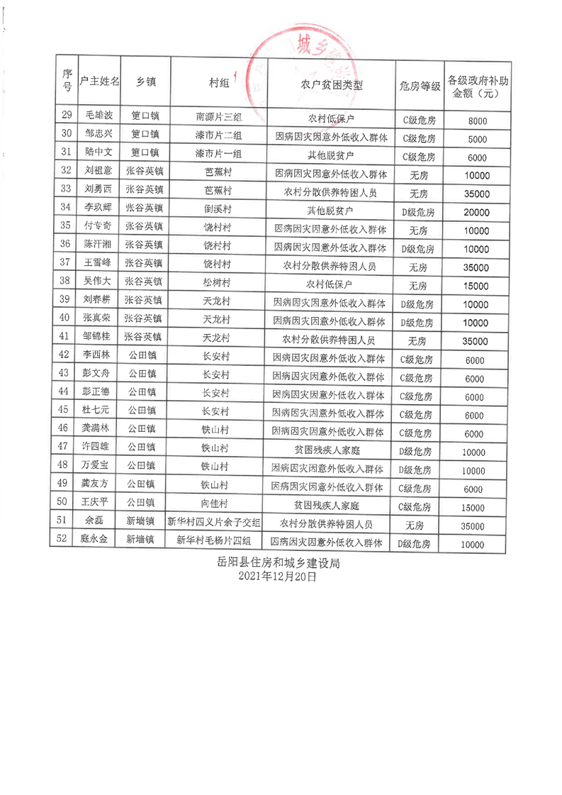 嶽陽縣2021年農村危房改造補助資金公示(二)