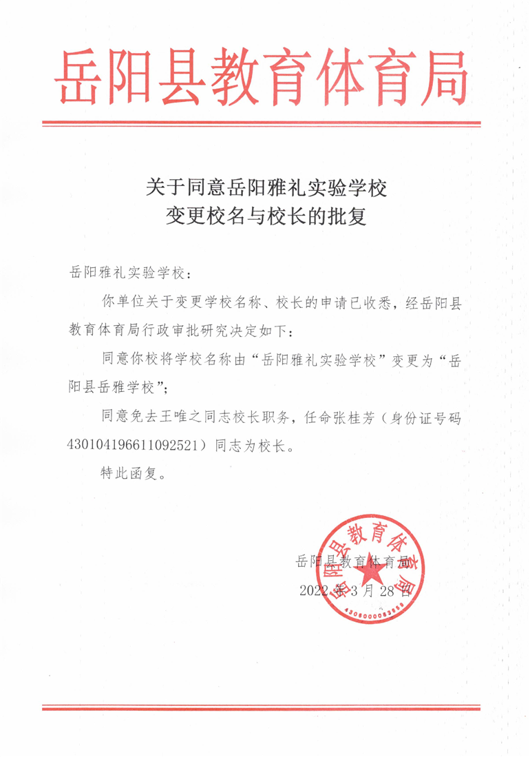 關於同意嶽陽雅禮實驗學校變更校名與校長的批複