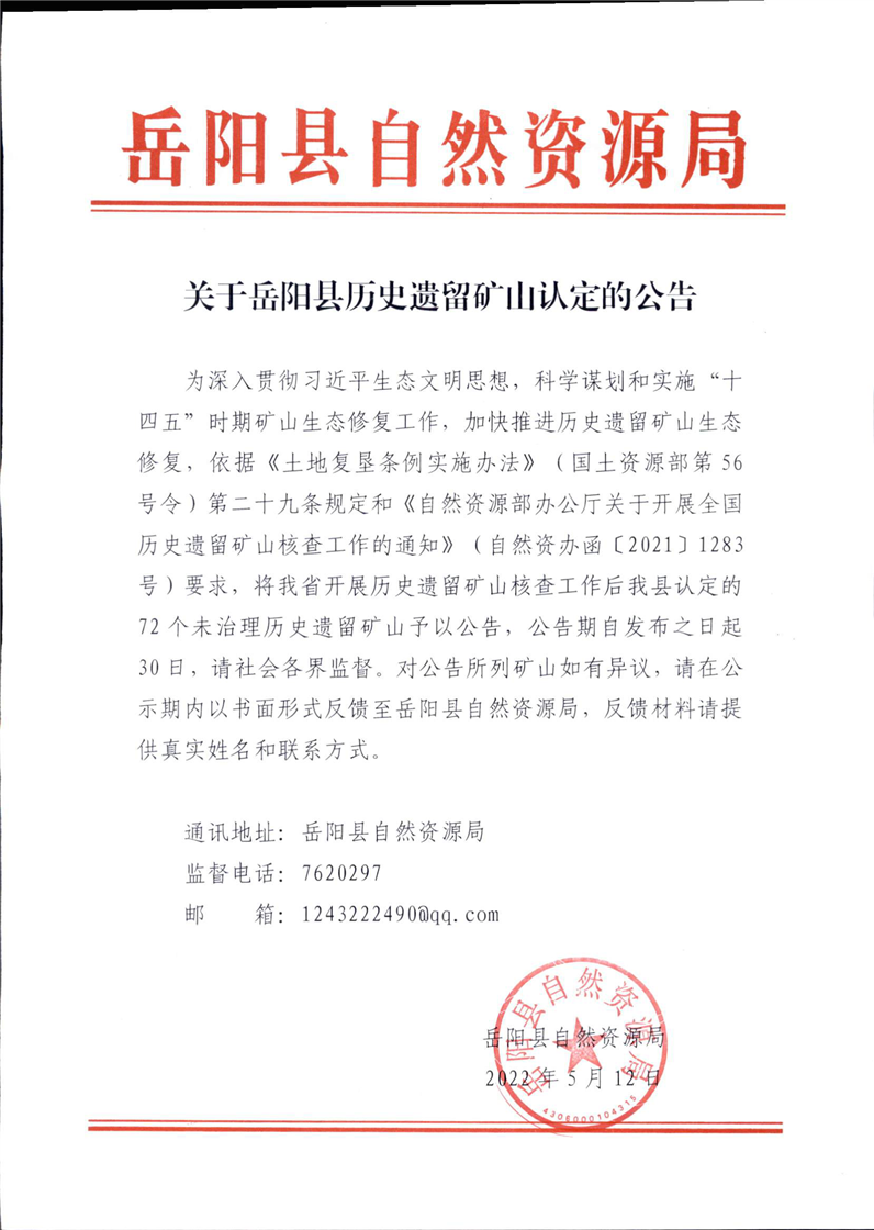 關於嶽陽縣曆史遺留礦山認定的公告