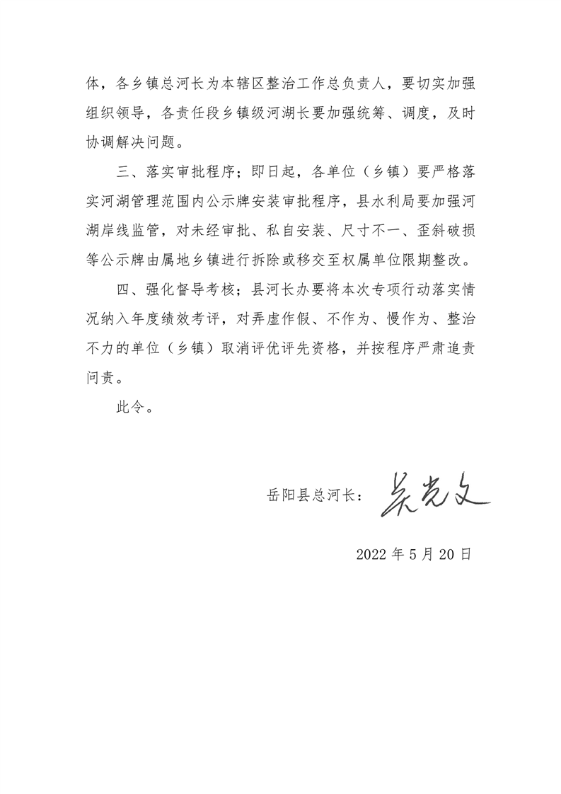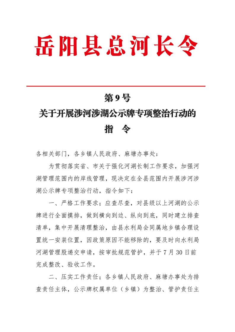 關於開展涉河涉湖公示牌專項整治行動的 指 令