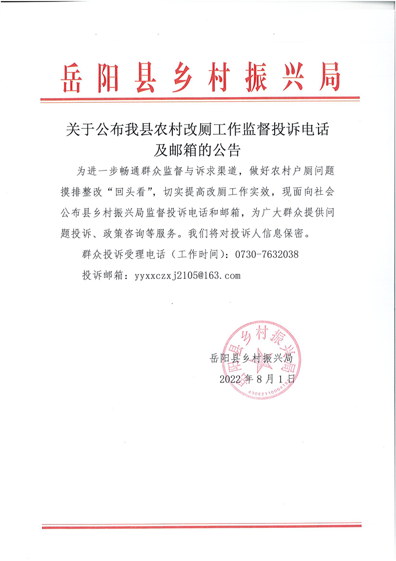 關於公布我縣農村改廁工作監督投訴電話及郵箱的公告