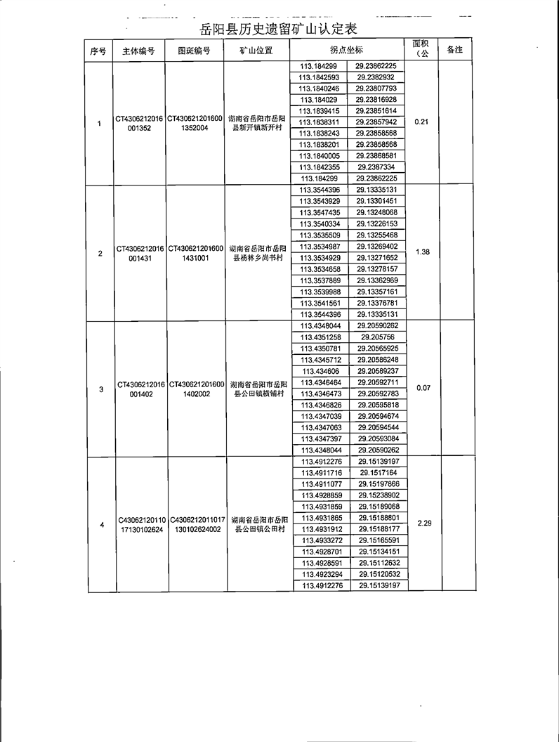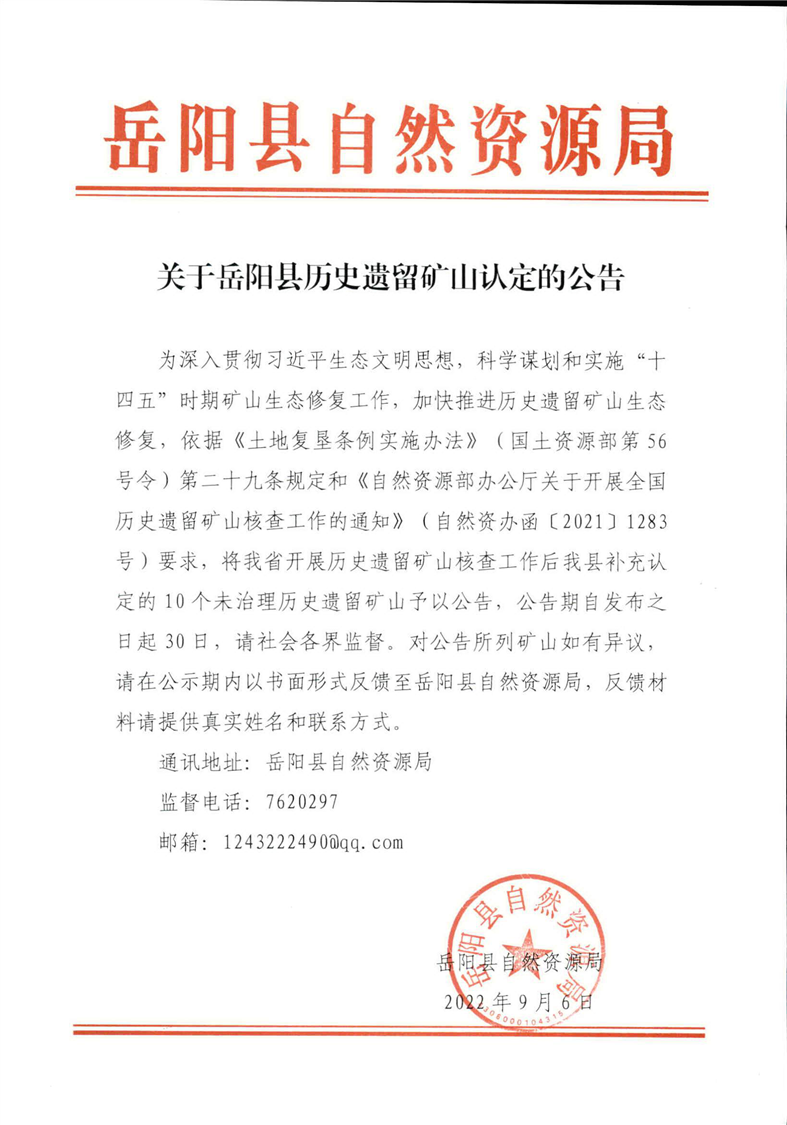 關於嶽陽縣曆史遺留礦山認定的公告(補充認定)