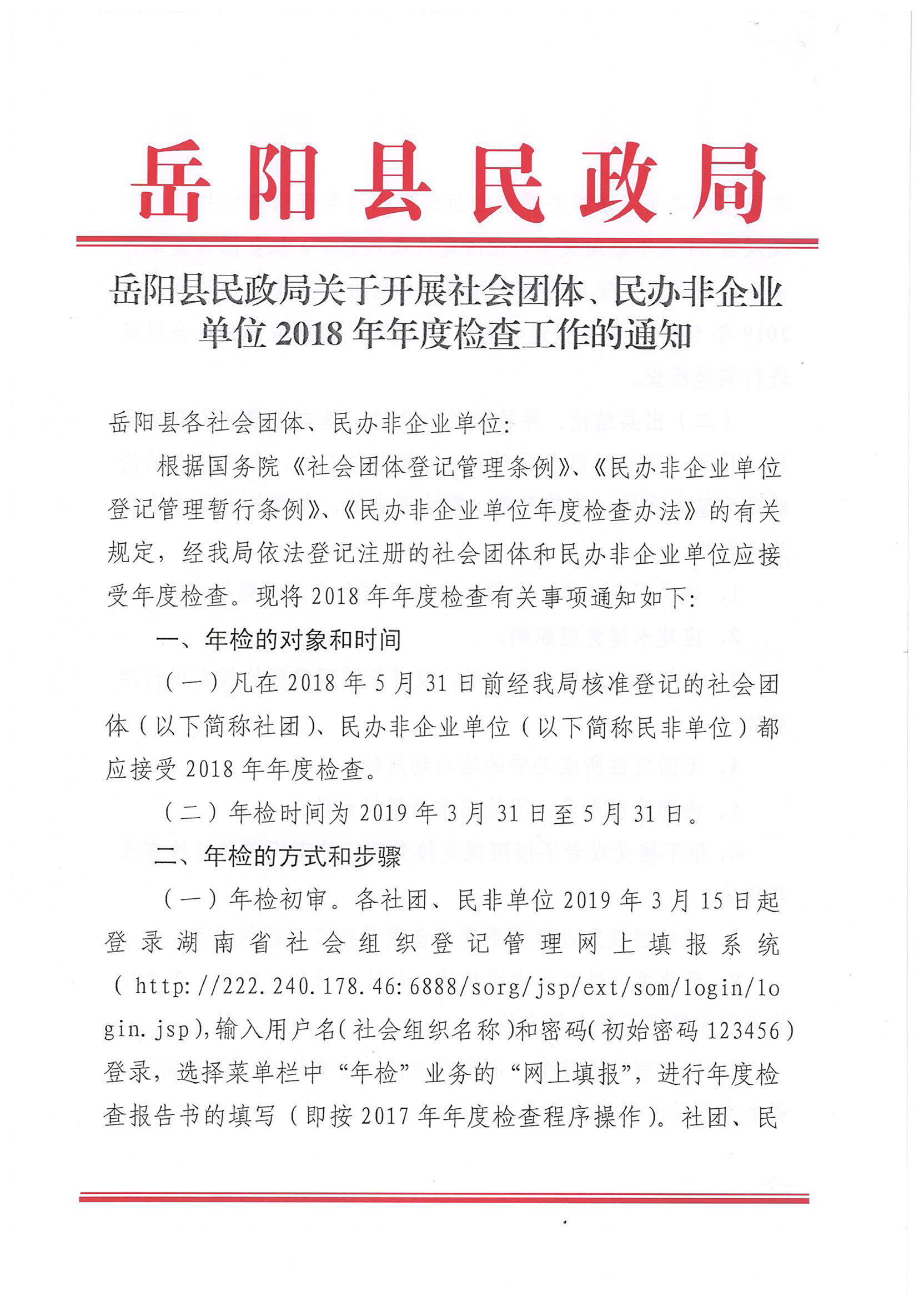 嶽陽縣民政局關於開展社會團體、民辦非企業單位2018年年度檢查工作的通知