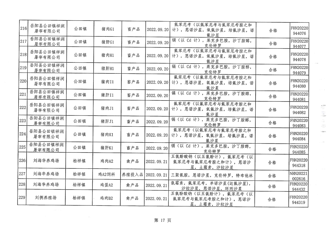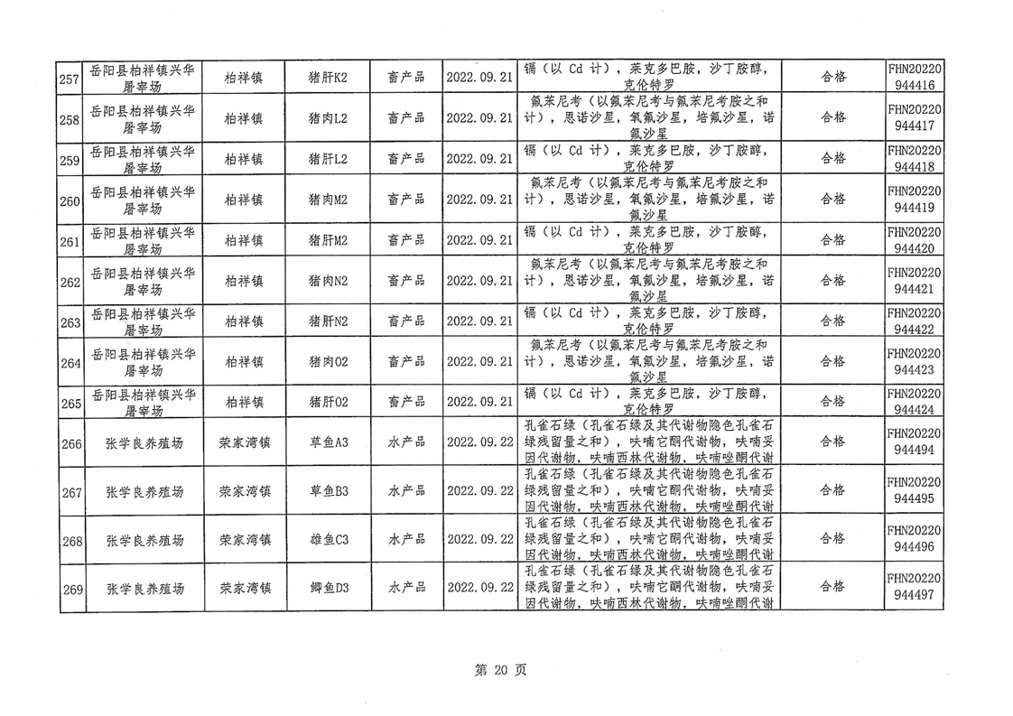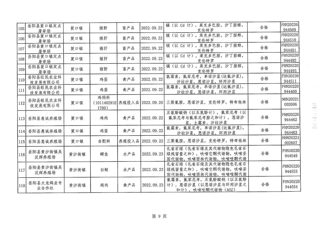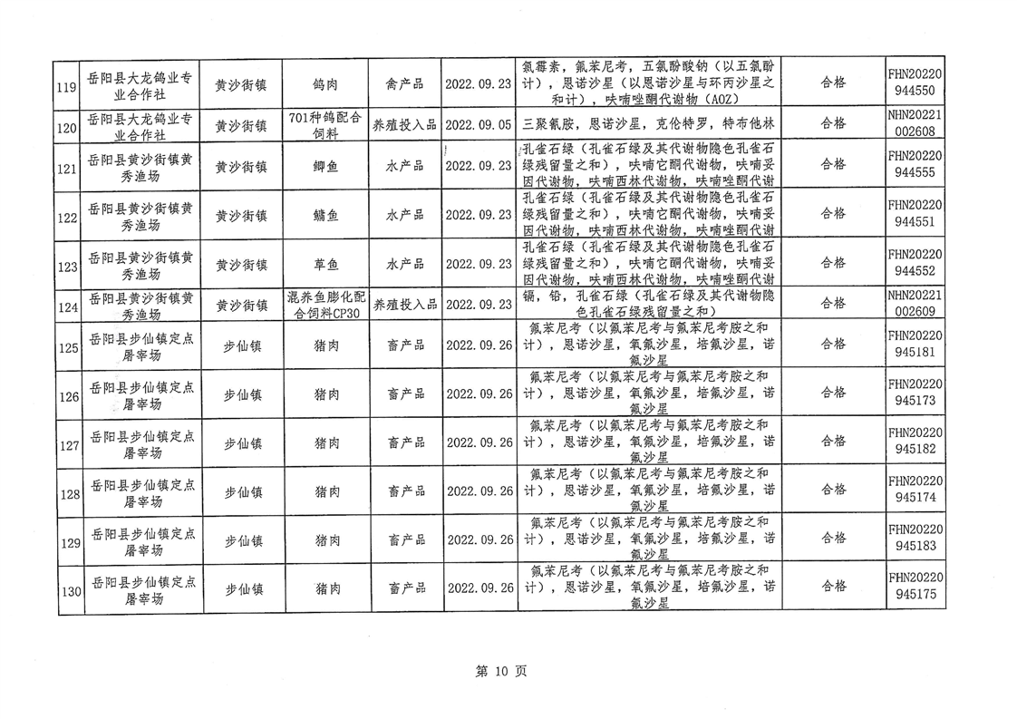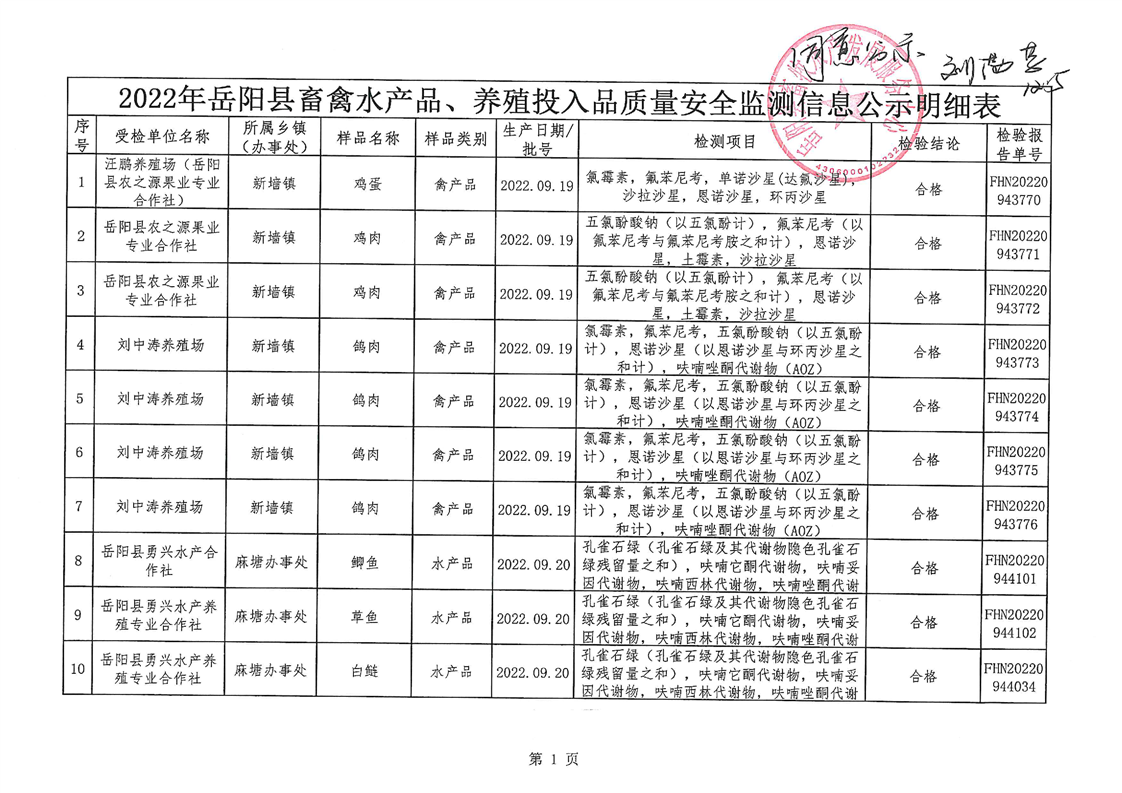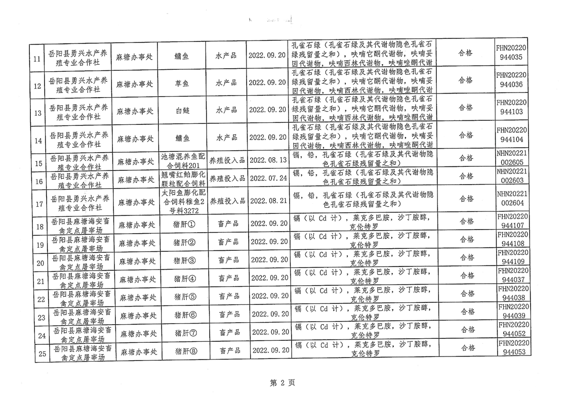 2022年嶽陽縣畜禽水產品、養殖投入品質量安全監測信息公示明細表