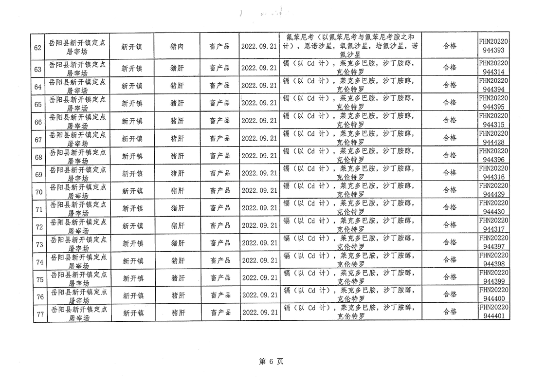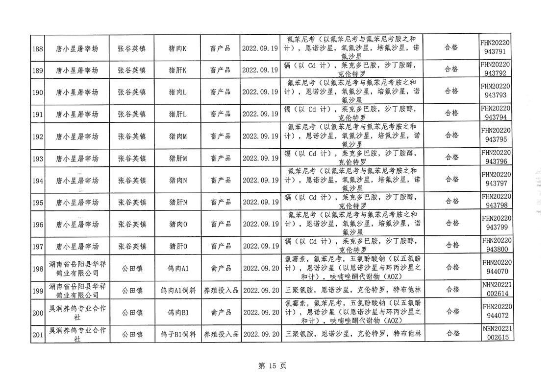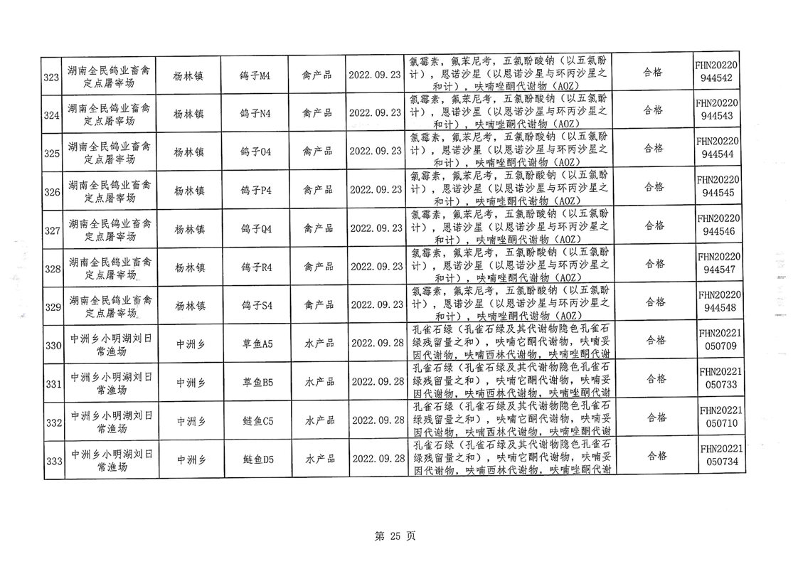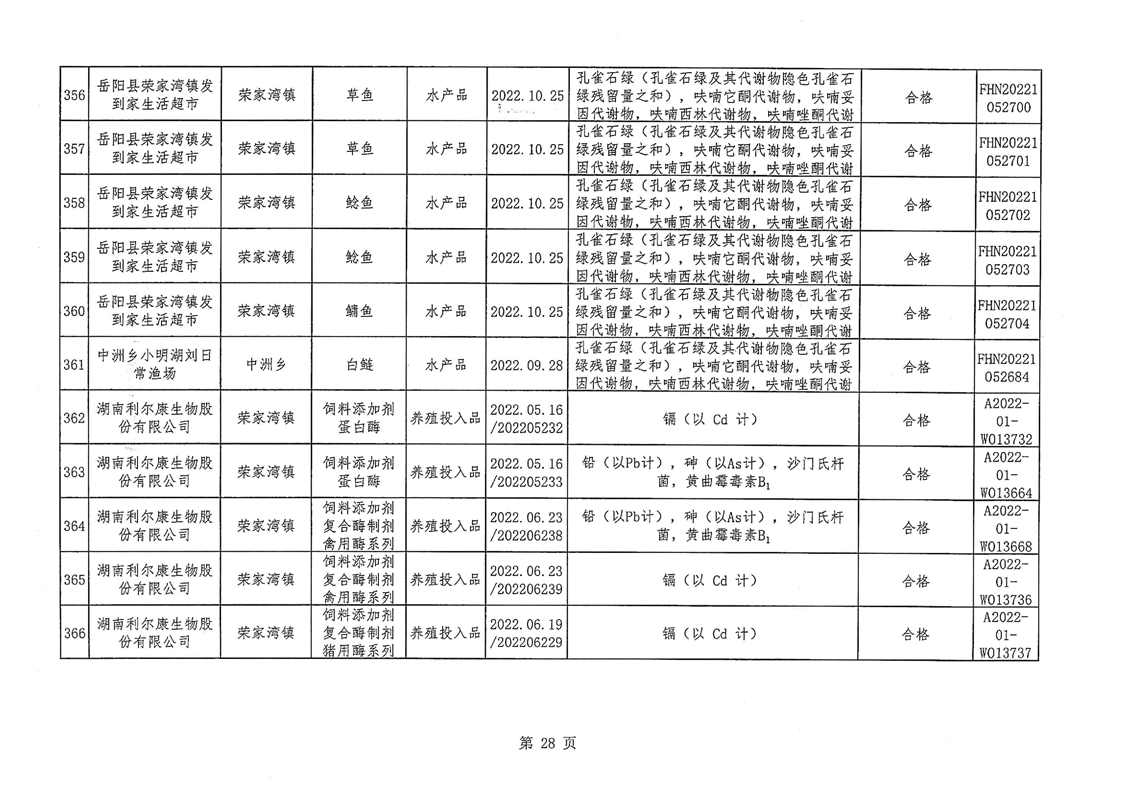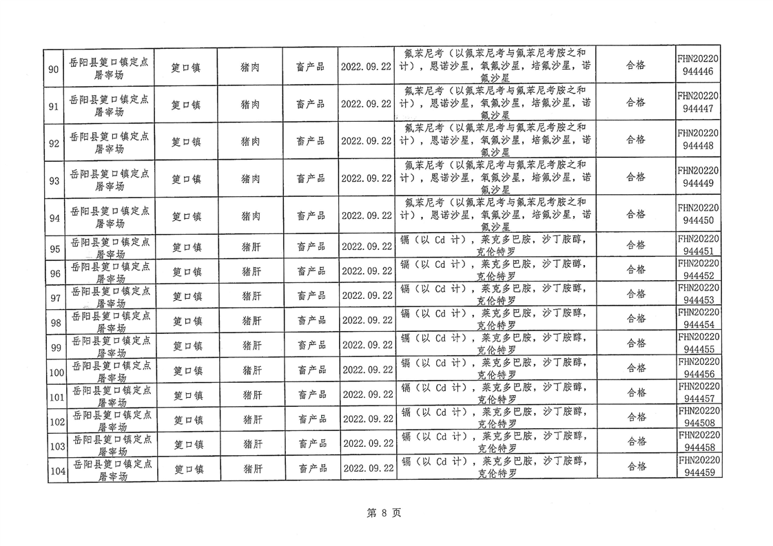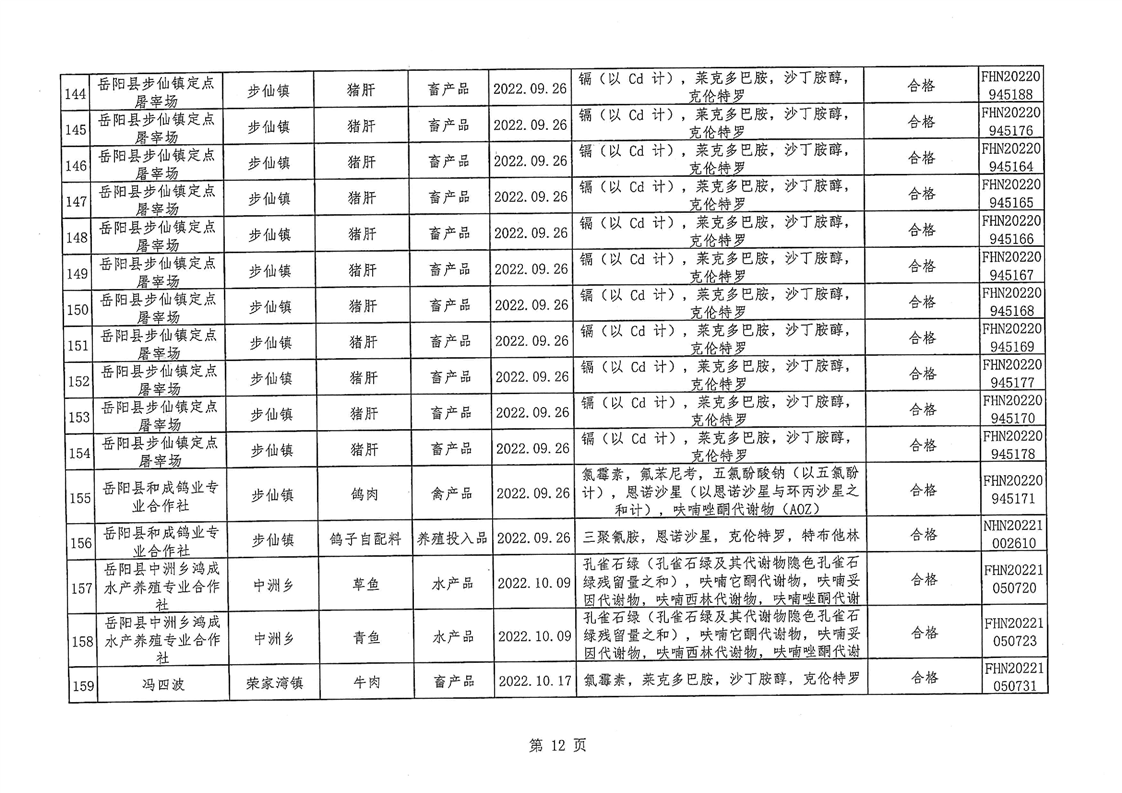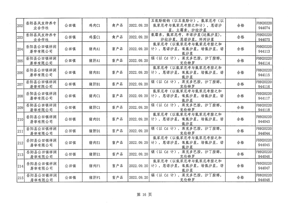 2022年嶽陽縣畜禽水產品、養殖投入品質量安全監測信息公示明細表