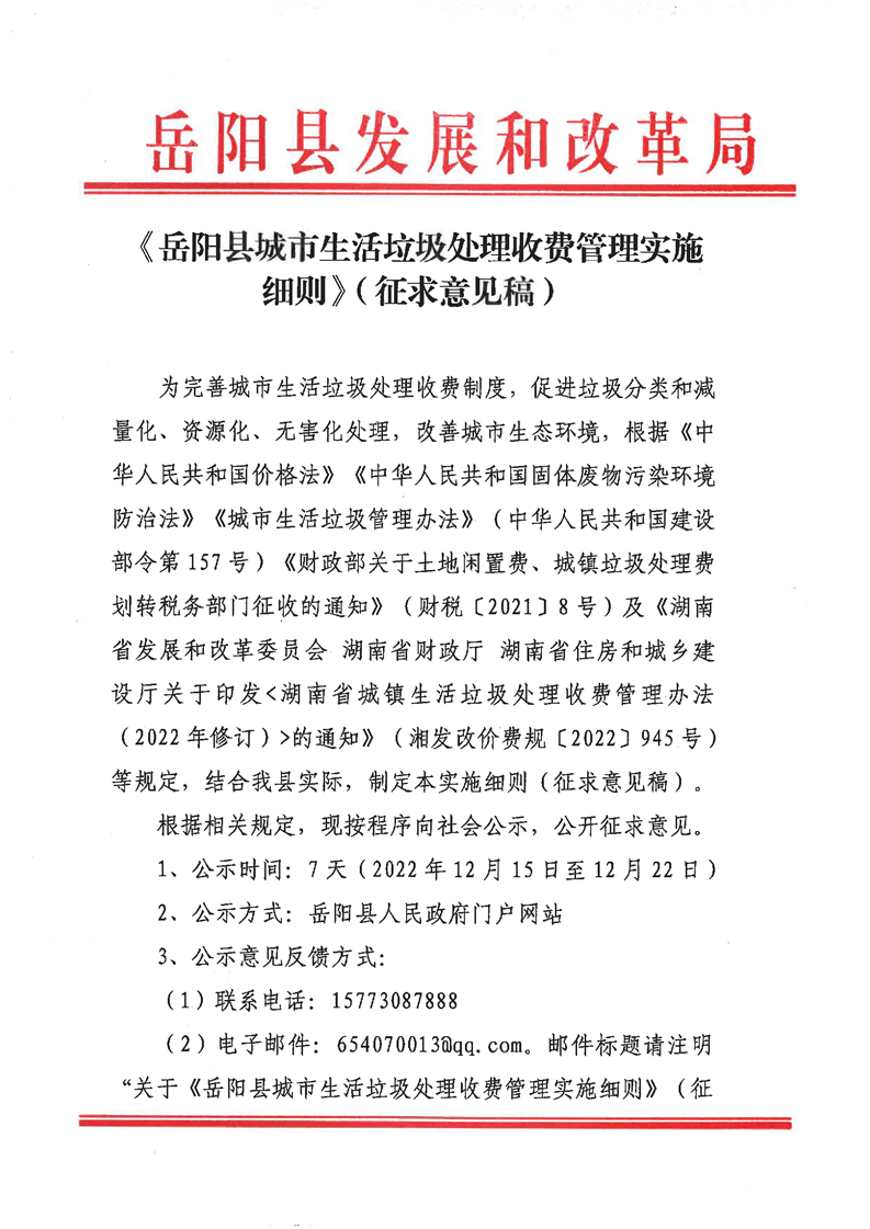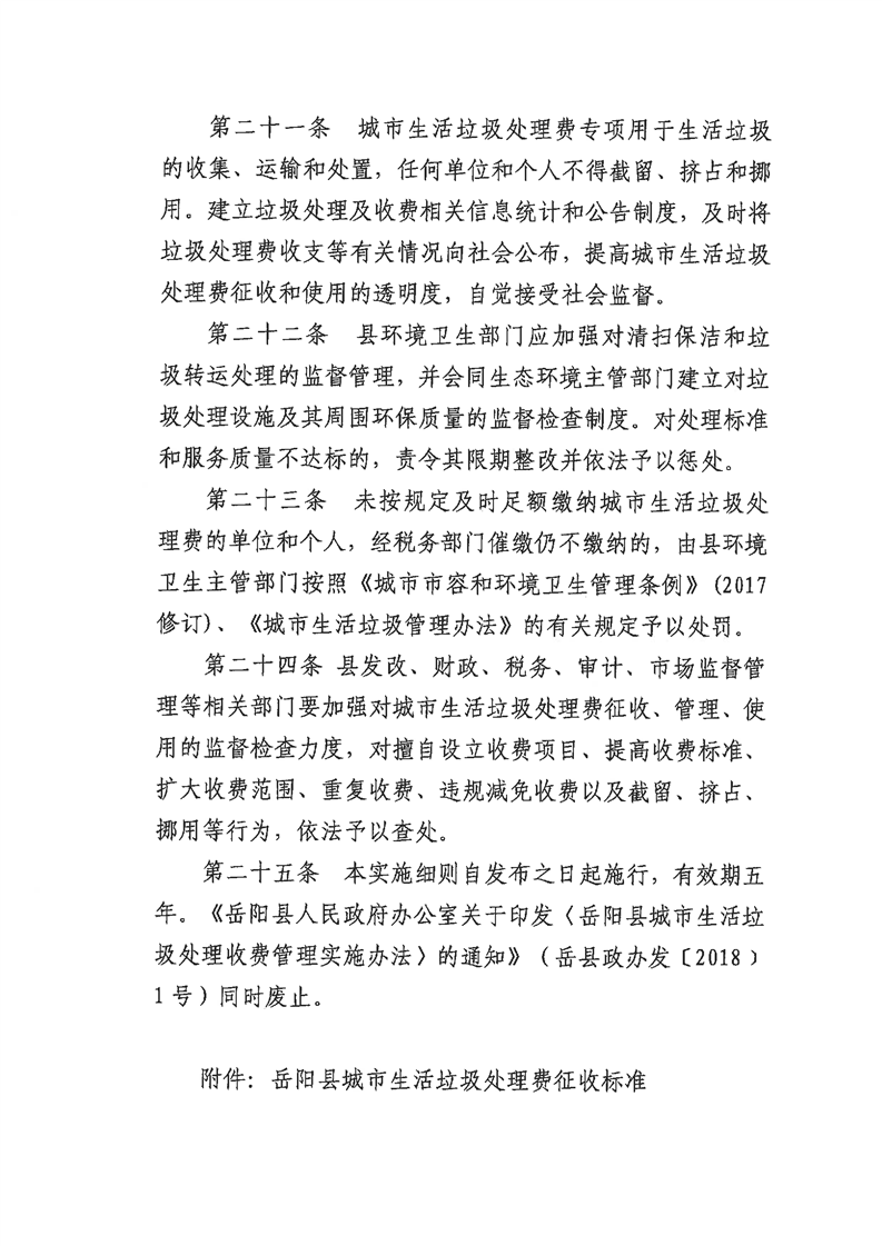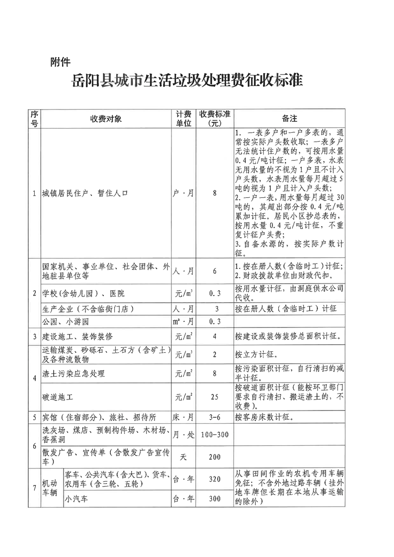 嶽陽縣城市生活垃圾處理收費管理實施細則(征求意見稿)