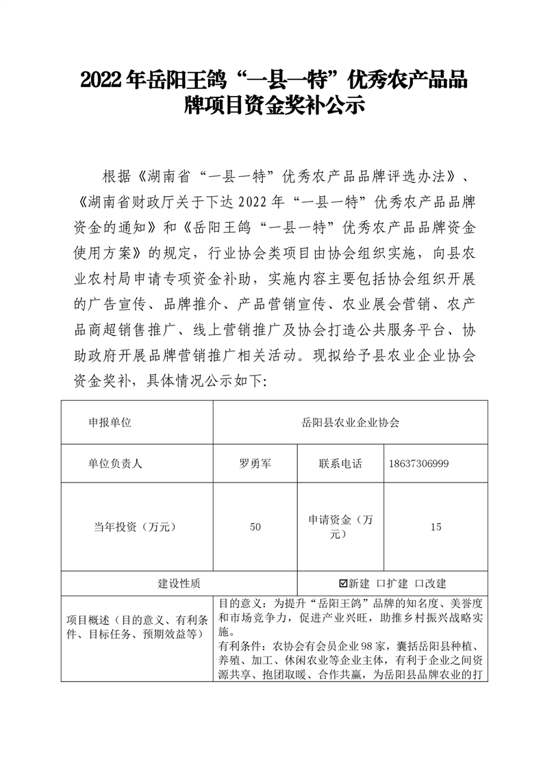 2022年嶽陽王鴿“一縣一特”優秀農產品品牌項目資金獎補公示