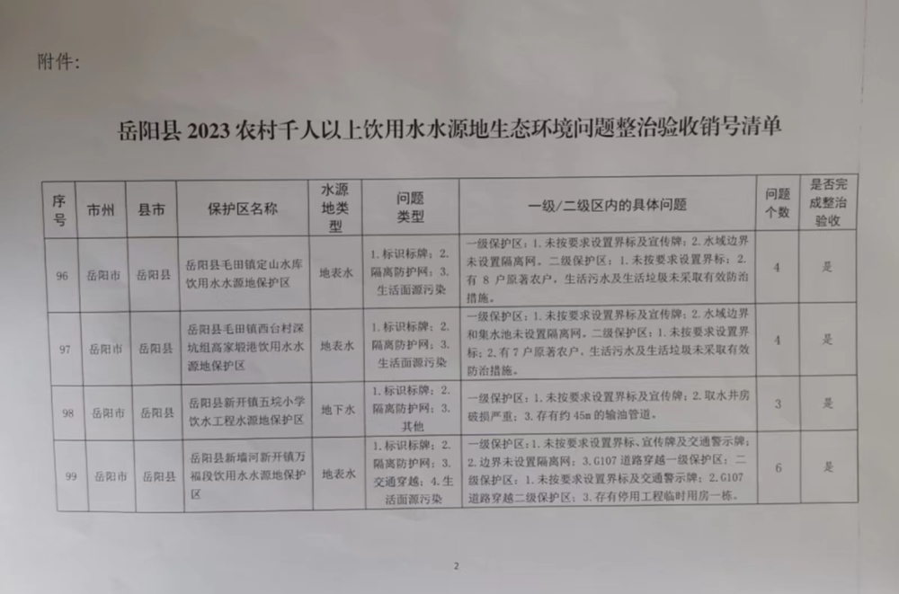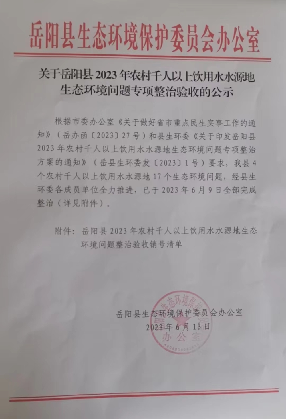 關於嶽陽縣2023年農村千人以上飲用水水源地生態環境問題專項整治驗收的公示