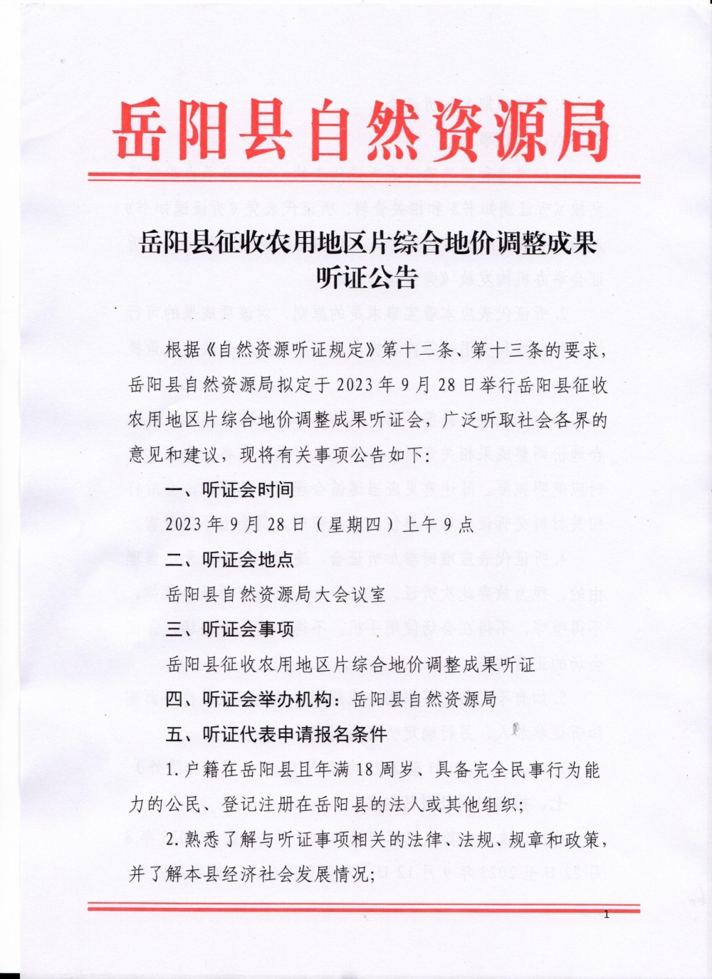 嶽陽縣征收農用地區片綜合地價調整成果聽證公告