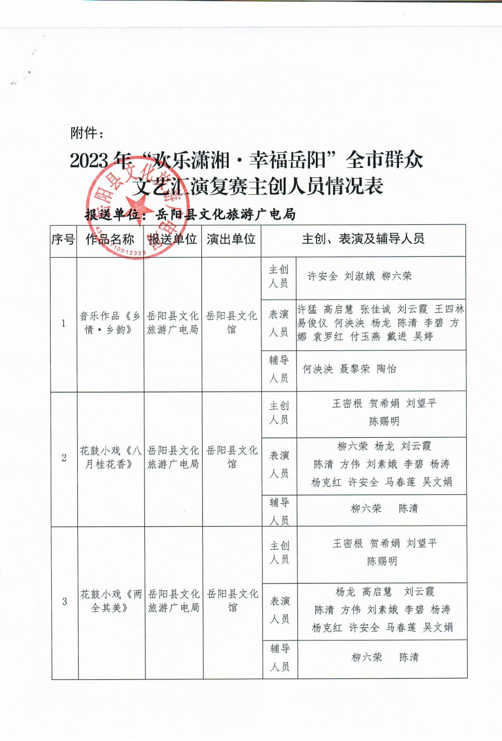 關於擬推薦參加2023年“歡樂瀟湘·幸福嶽陽”全市群眾文藝匯演複賽參賽作品及主創人員名單公示