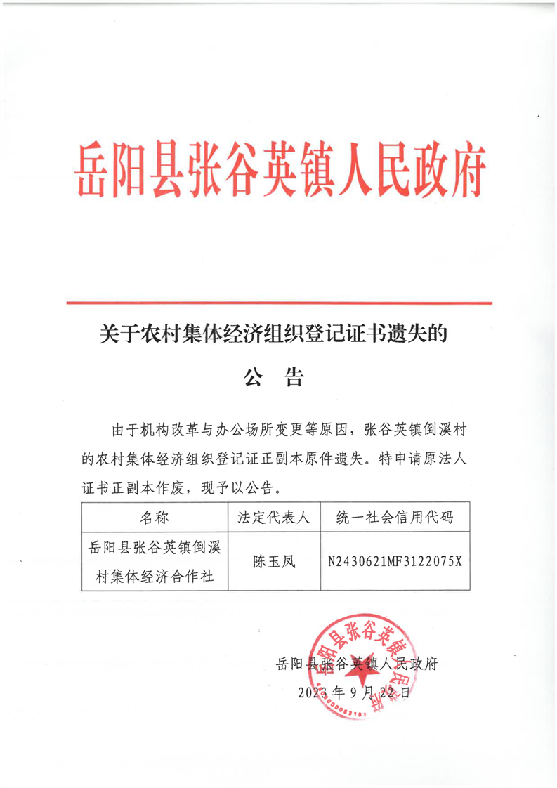 關於農村集體經濟組織登記證書遺失的公告