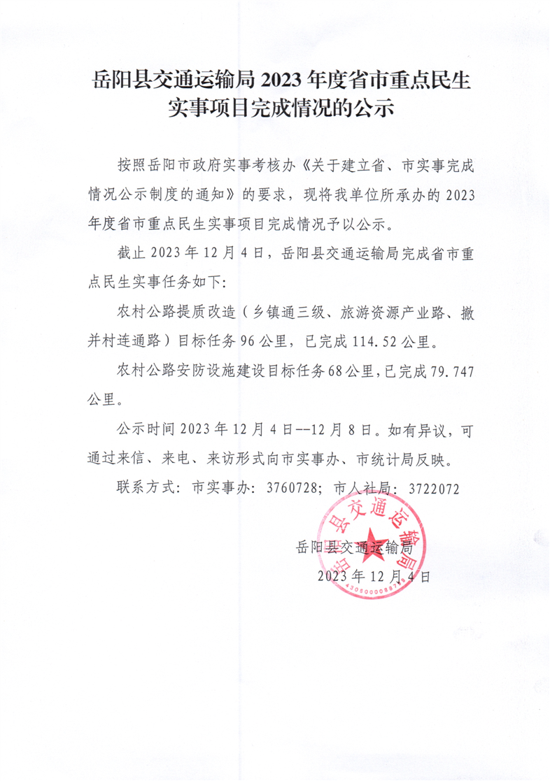 嶽陽縣交通運輸局2023年度省市重點民生實事項目完成情況的公示
