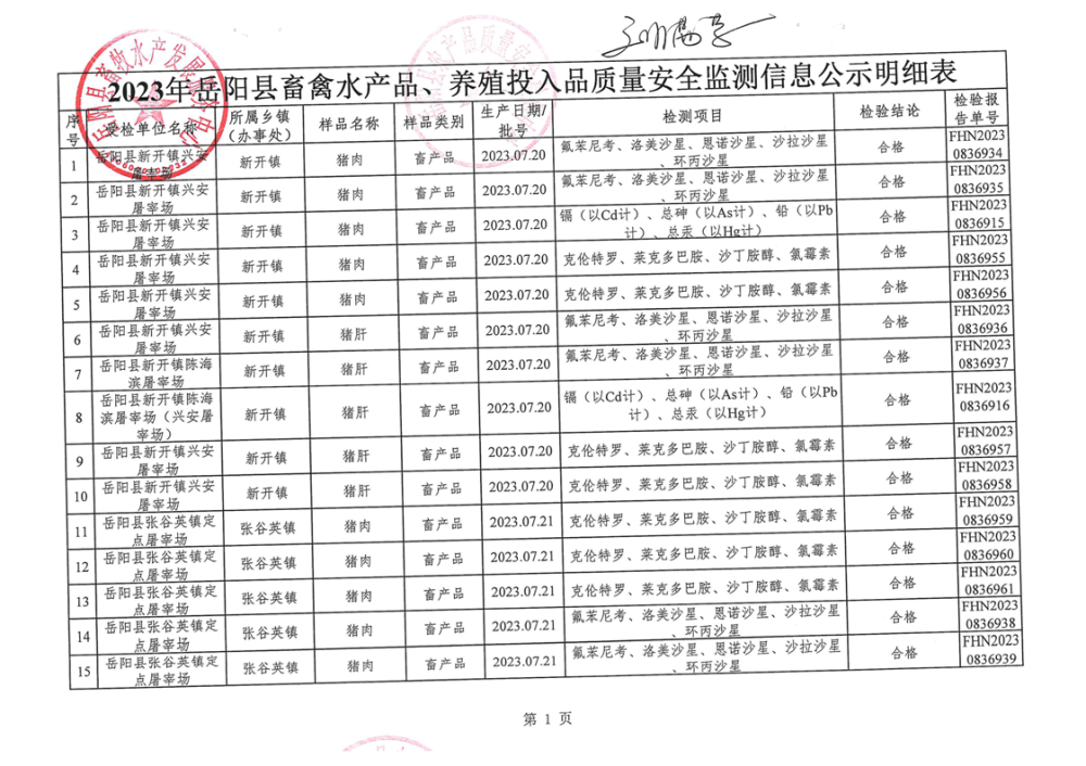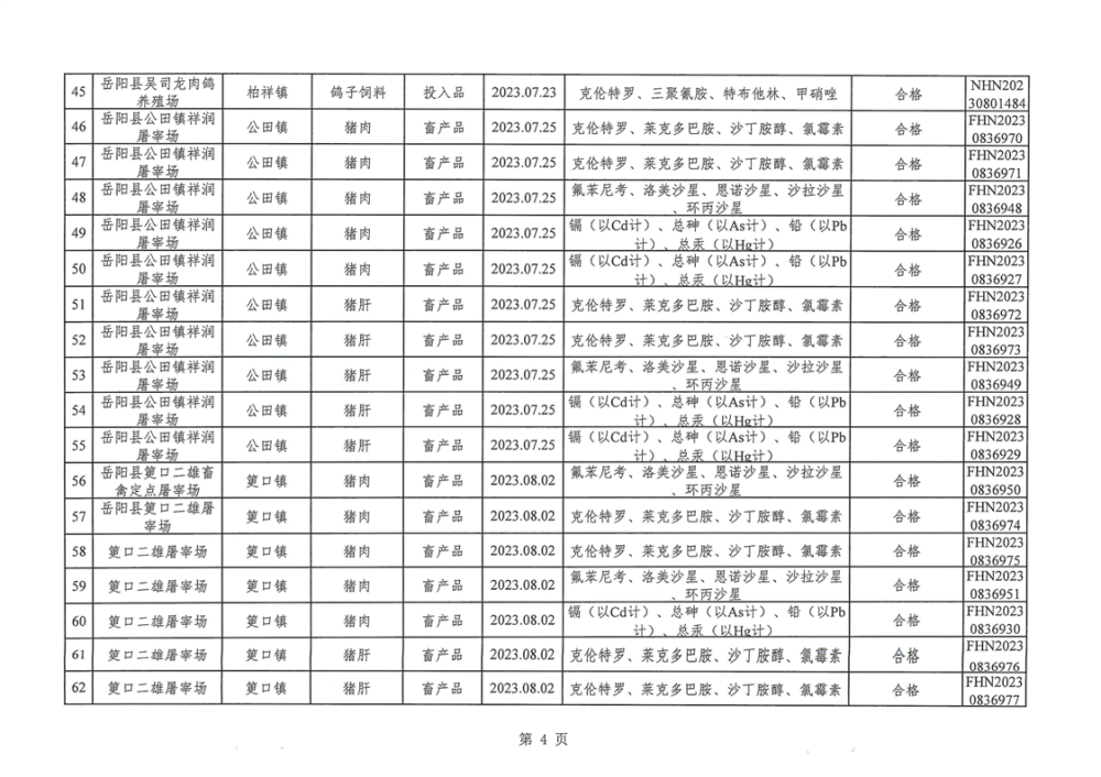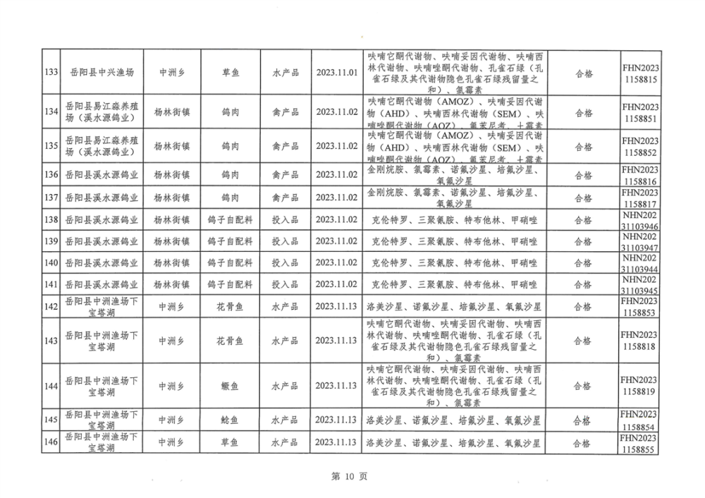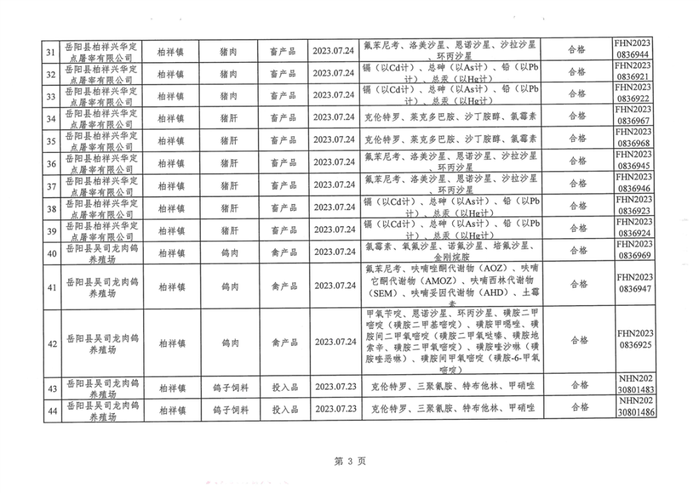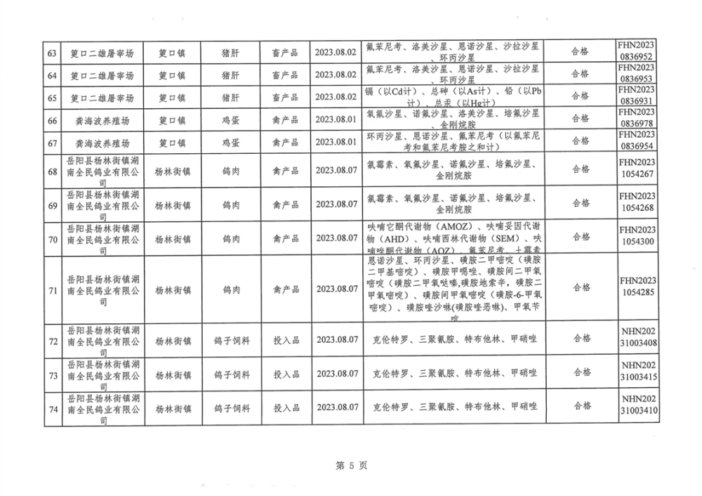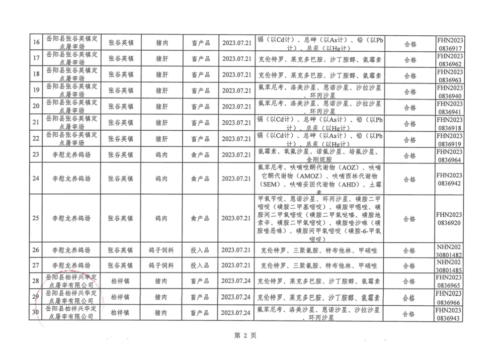 2023年嶽陽縣畜禽水產品、養殖投入品質量安全監測信息公示明細表