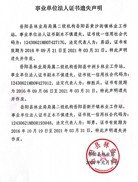 嶽陽縣黃沙街鎮林業工作站、中洲鄉林業工作站、新開鎮林業工作站法人登記證遺失聲明