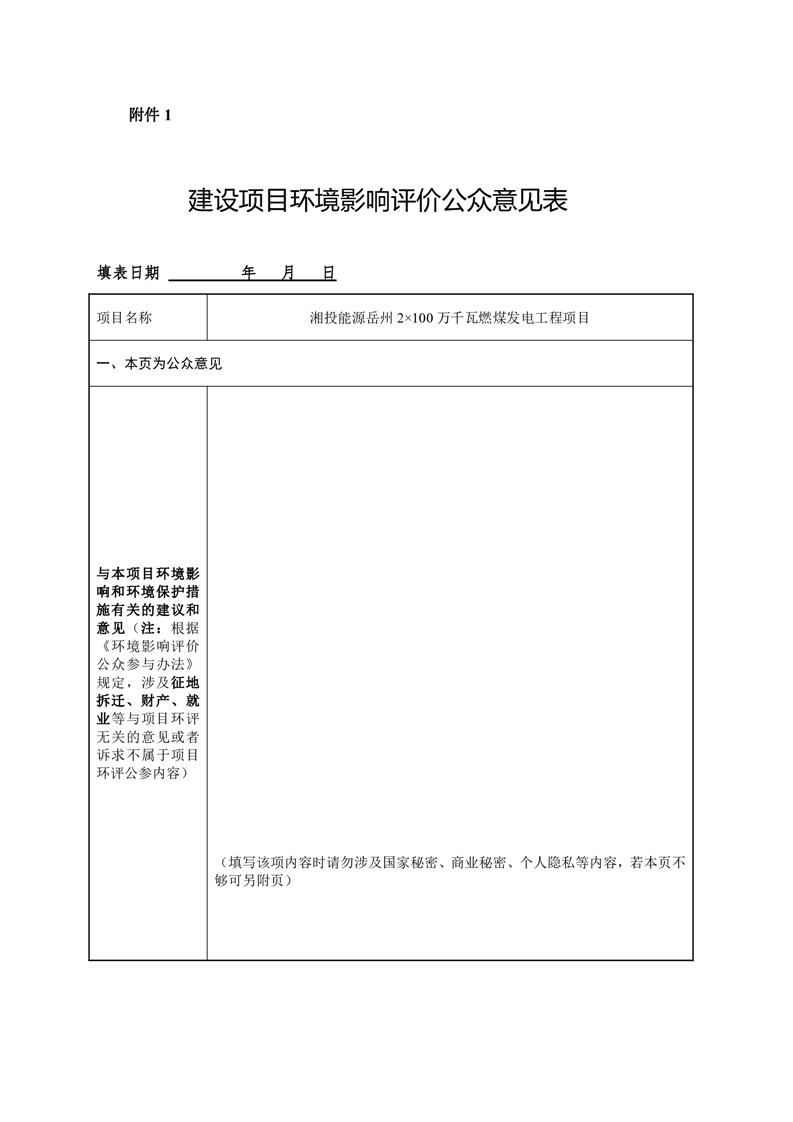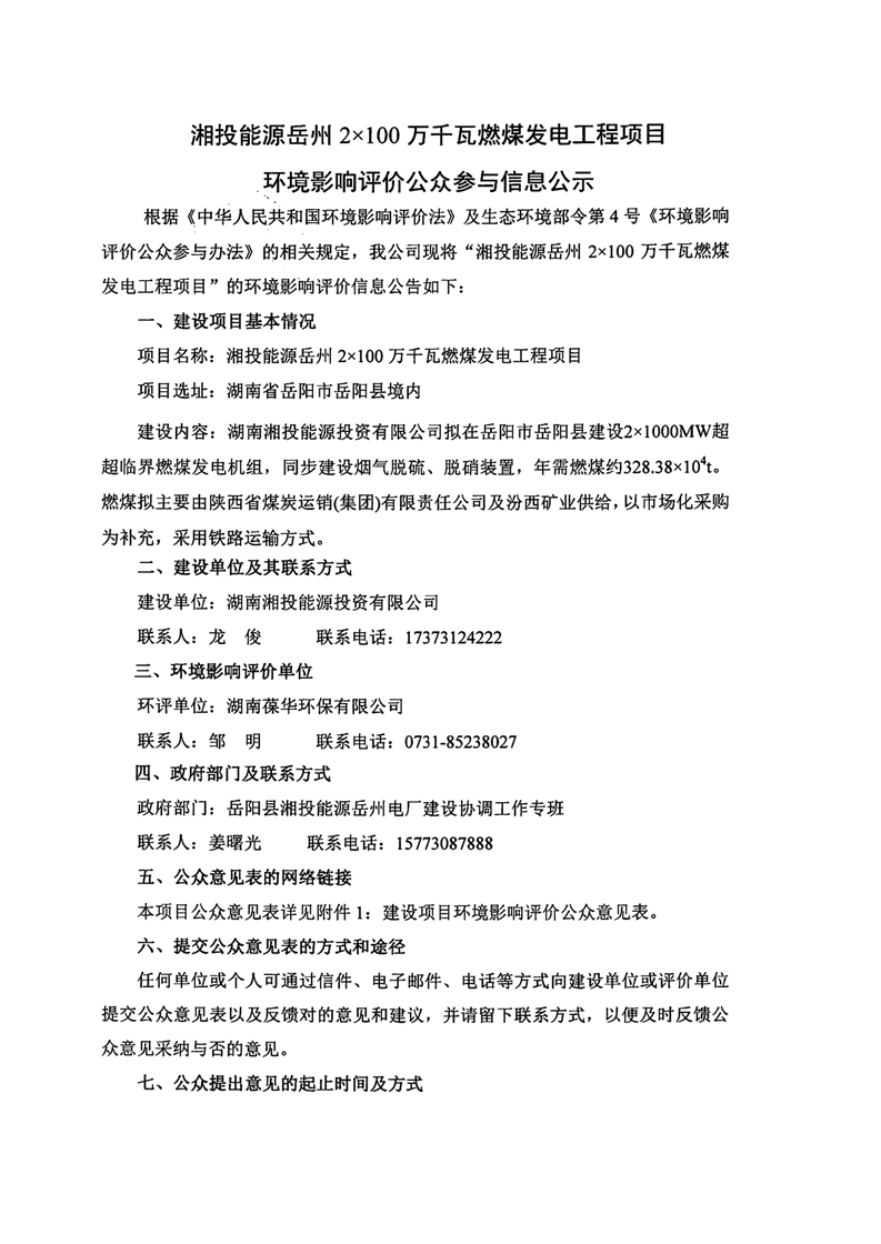 湘投能源嶽州2x100萬千瓦燃煤發電工程項目環境影響評價公眾參與信息公示