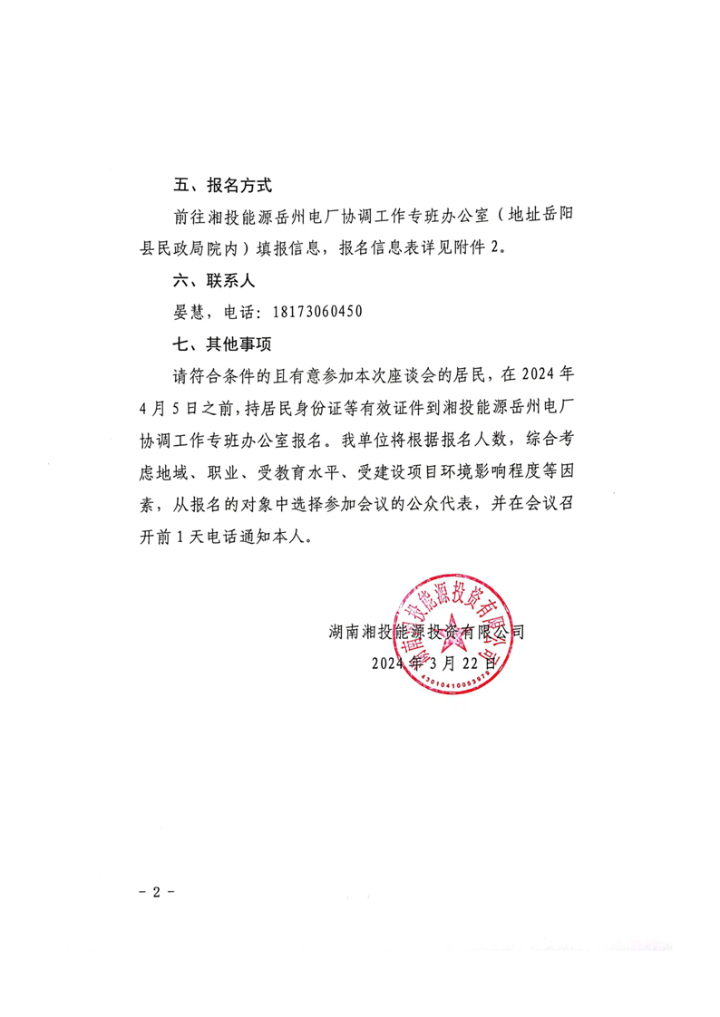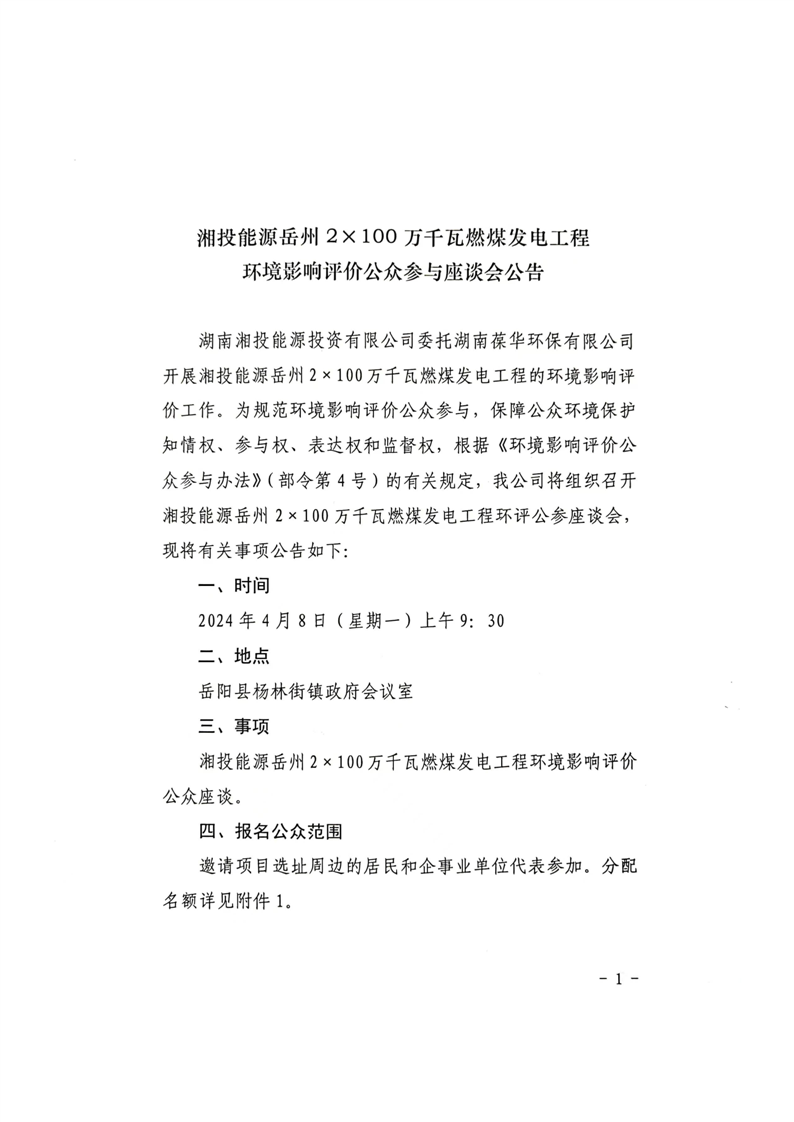 湘投能源嶽州2×100萬千瓦燃煤發電工程環評公眾參與座談會公告