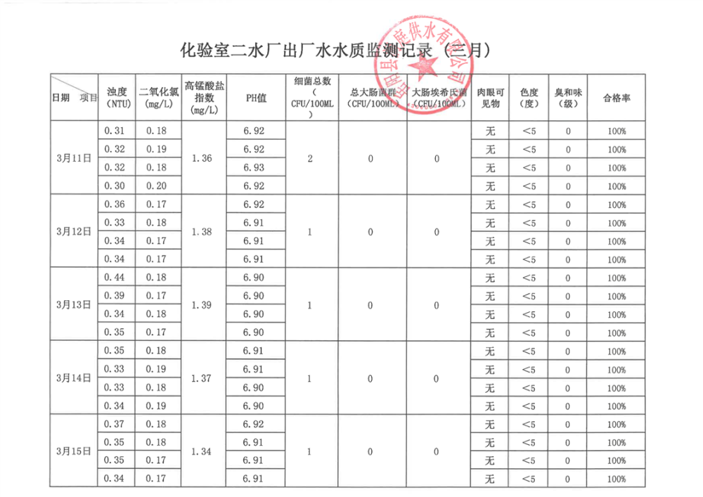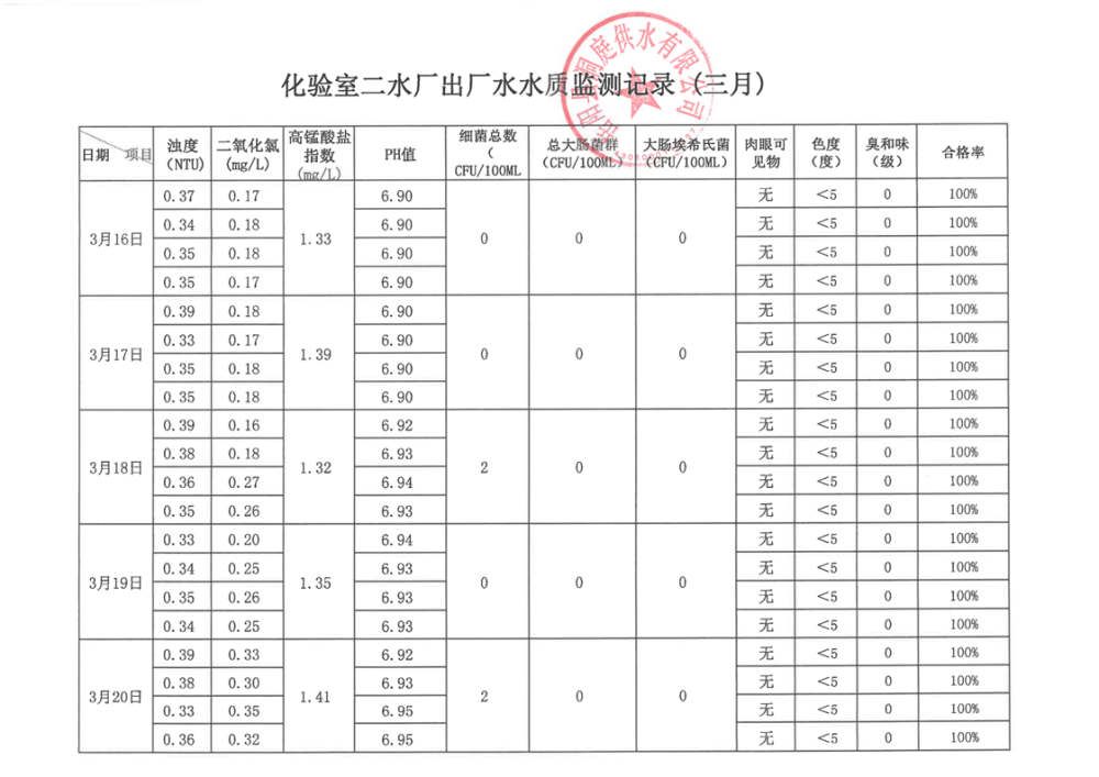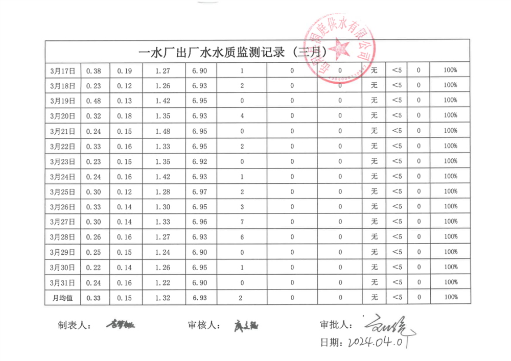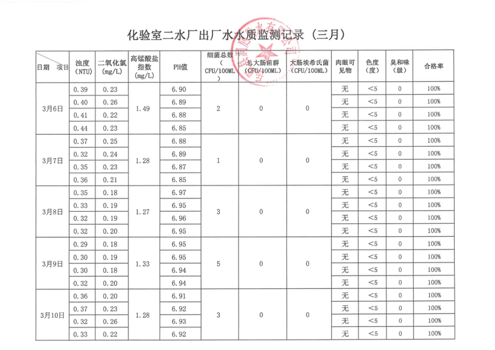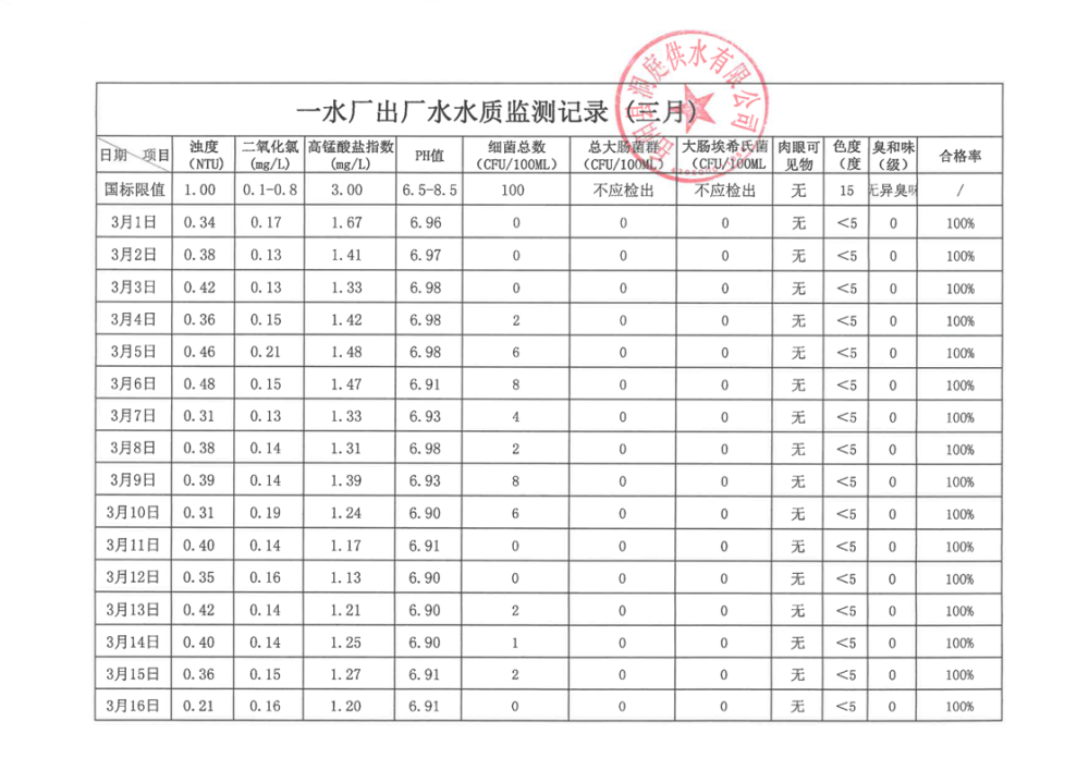 嶽陽縣洞庭供水有限公司水質檢測信息公開(三月份)