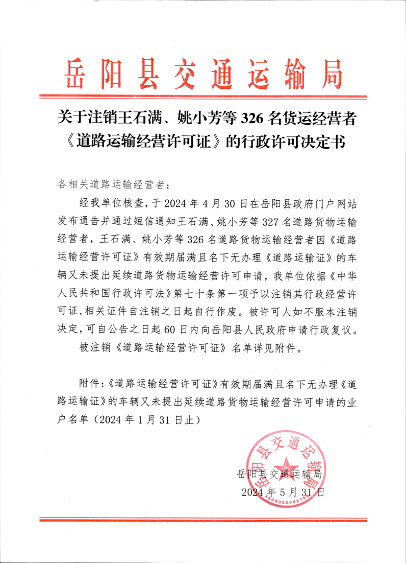 關於注銷王石滿、姚小芳等326名貨運經營者《道路運輸經營許可證》的行政許可決定書