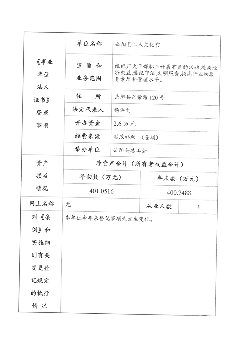 嶽陽縣工人文化宮事業單位法人年度報告書