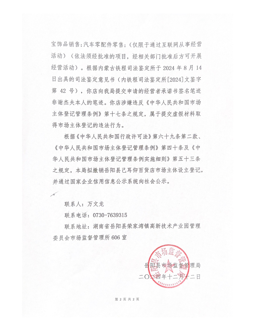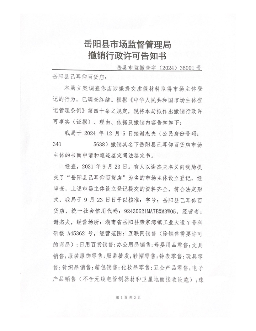 嶽陽縣市場監督管理局撤銷行政許可告知書