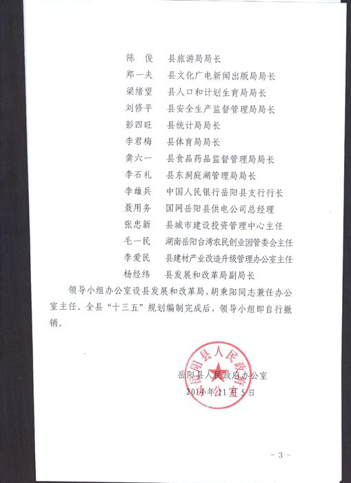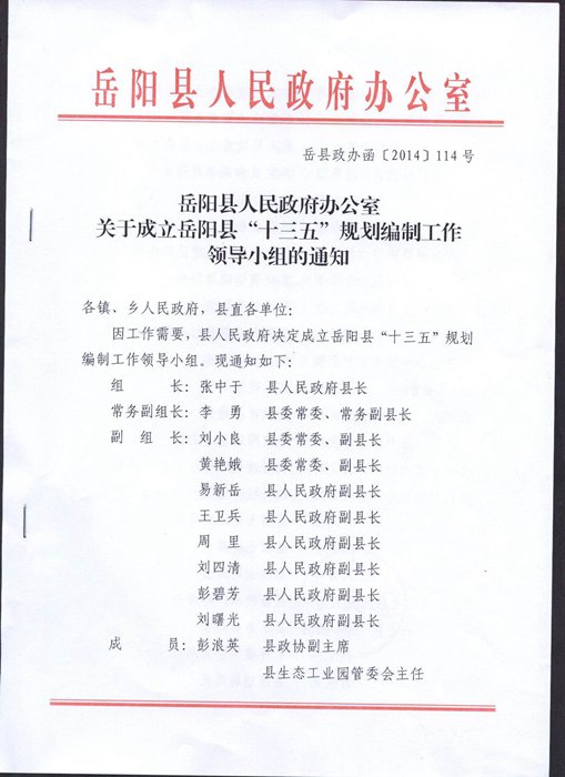 嶽陽縣人民政府辦公室關於成立嶽陽縣“十三五”規劃編製工作領導小組的通知