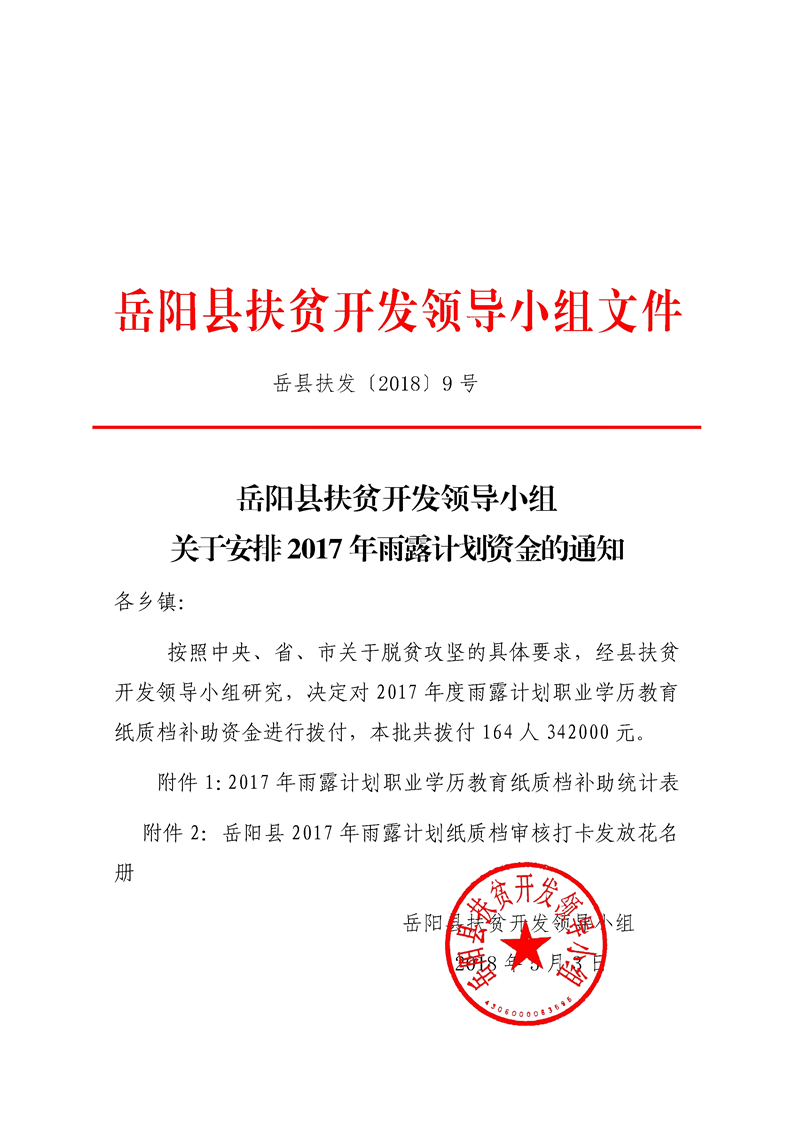 嶽縣扶發【2018】9號——關於安排2017年雨露計劃資金的通知