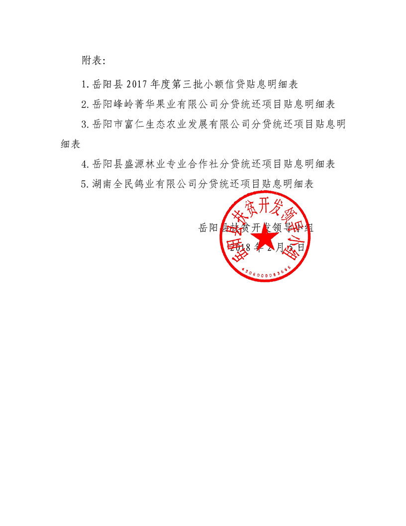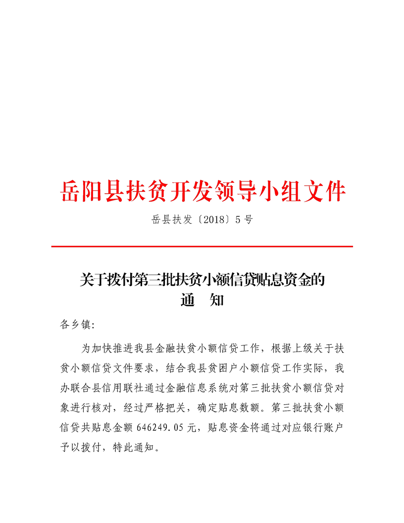 嶽縣扶發【2018】5號——關於撥付第三批扶貧小額信貸貼息資金的通知