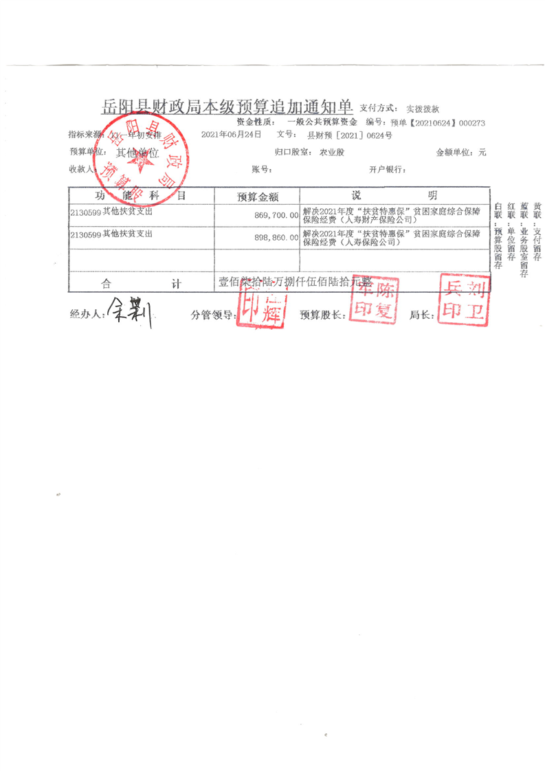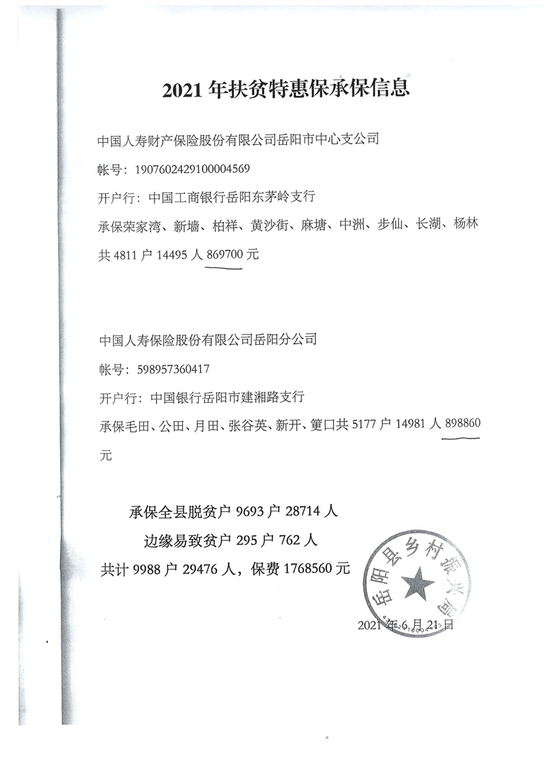 嶽陽縣下達2021年度“扶貧特惠保”貧困家庭綜合保障保險經費公開公示