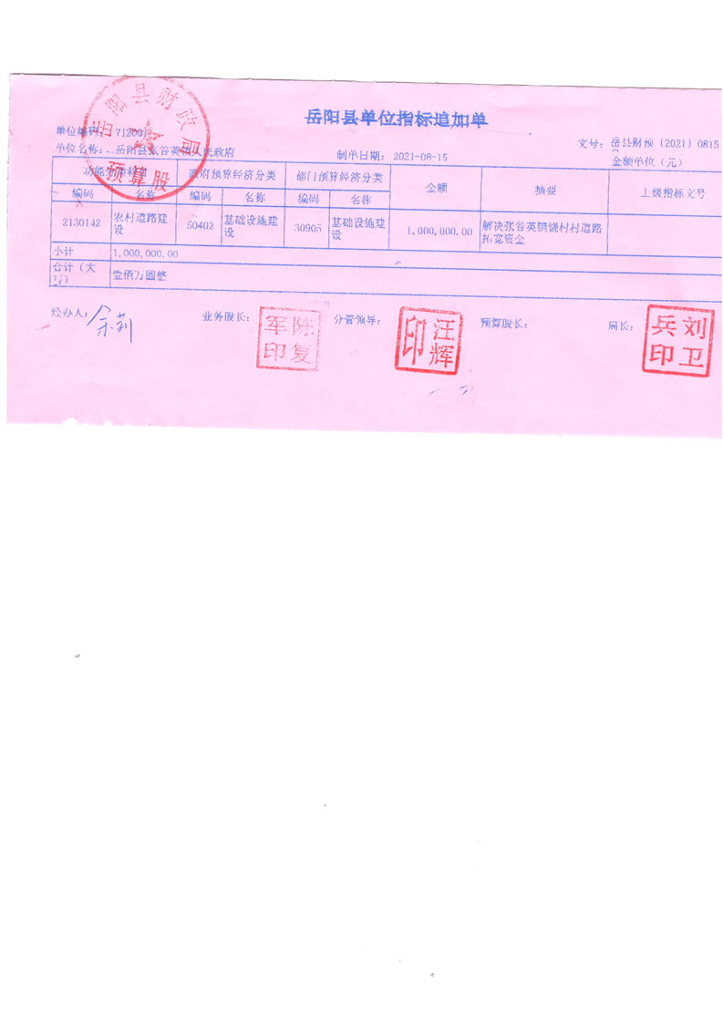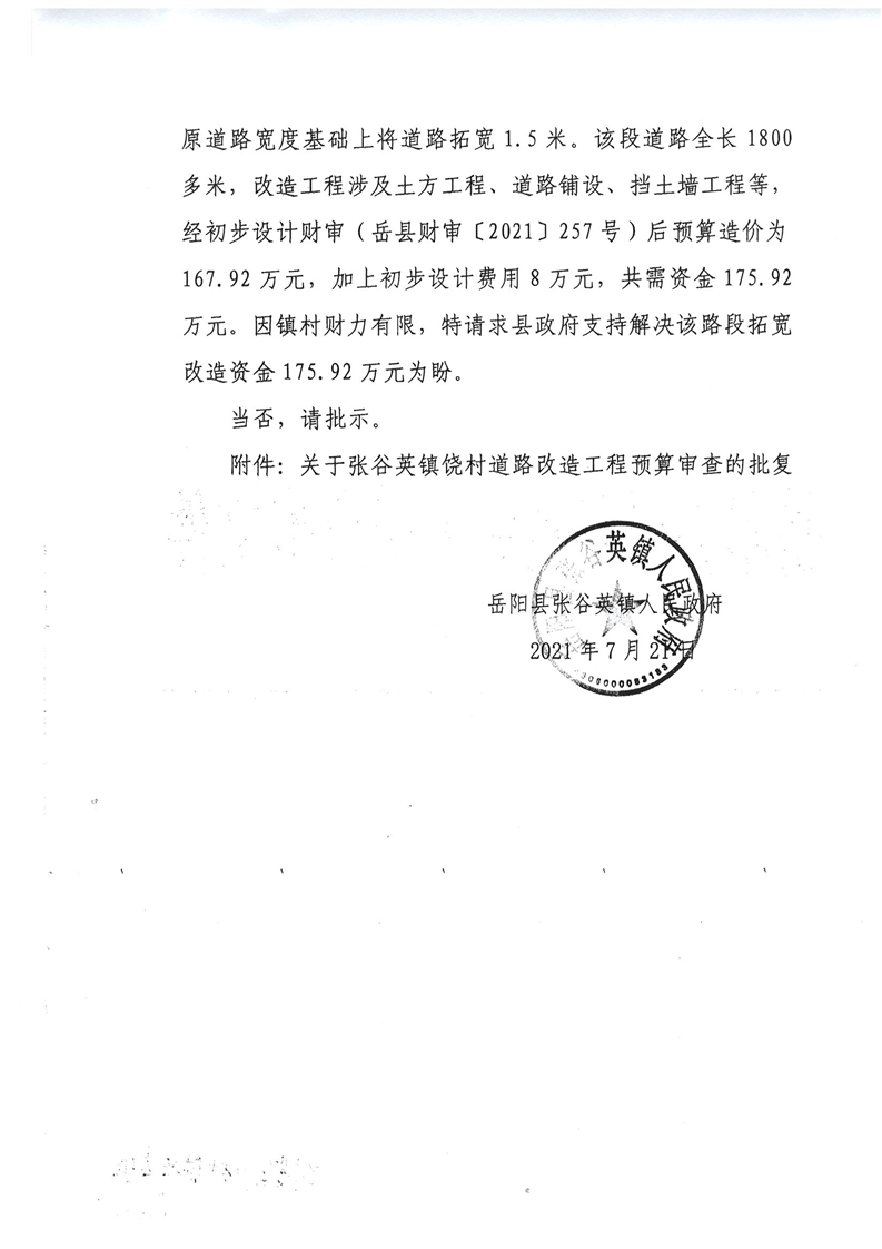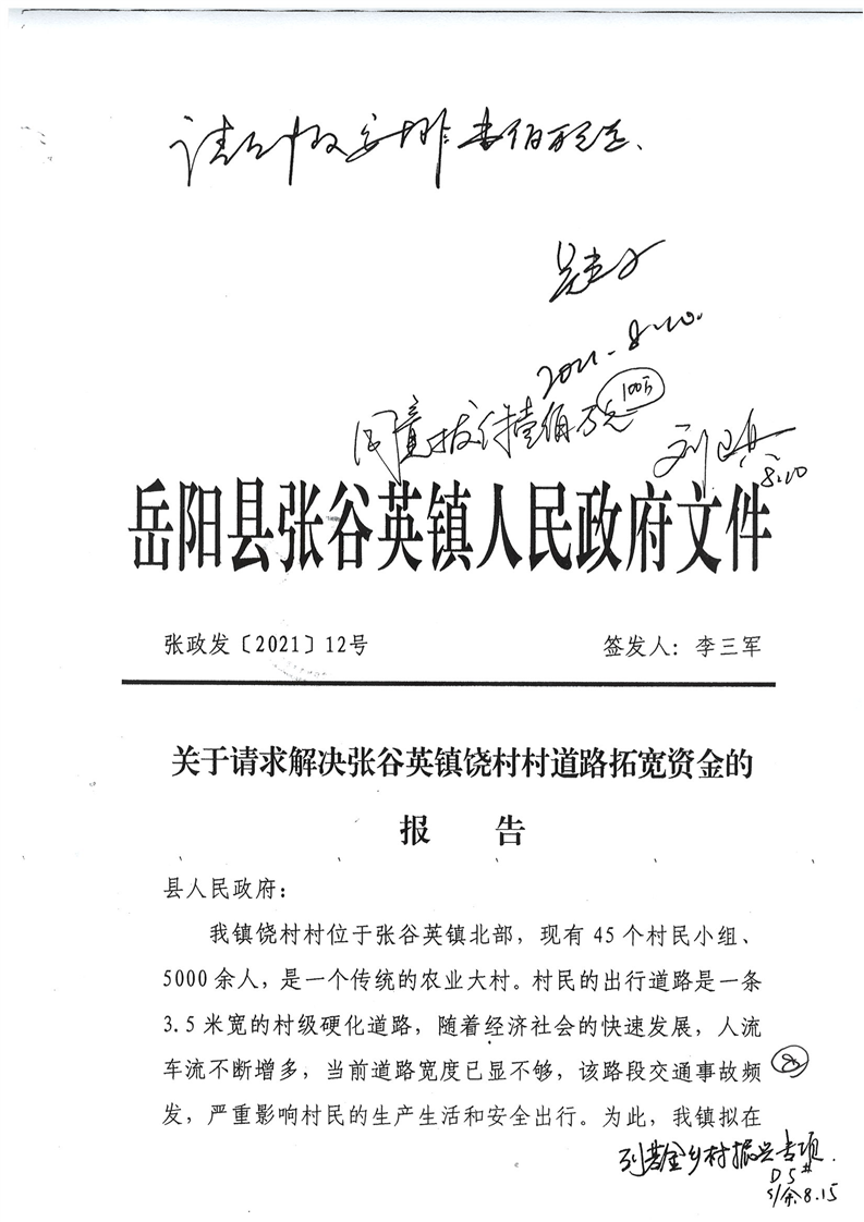 嶽陽縣下達張穀英鎮饒村村道路拓寬資金公開公示