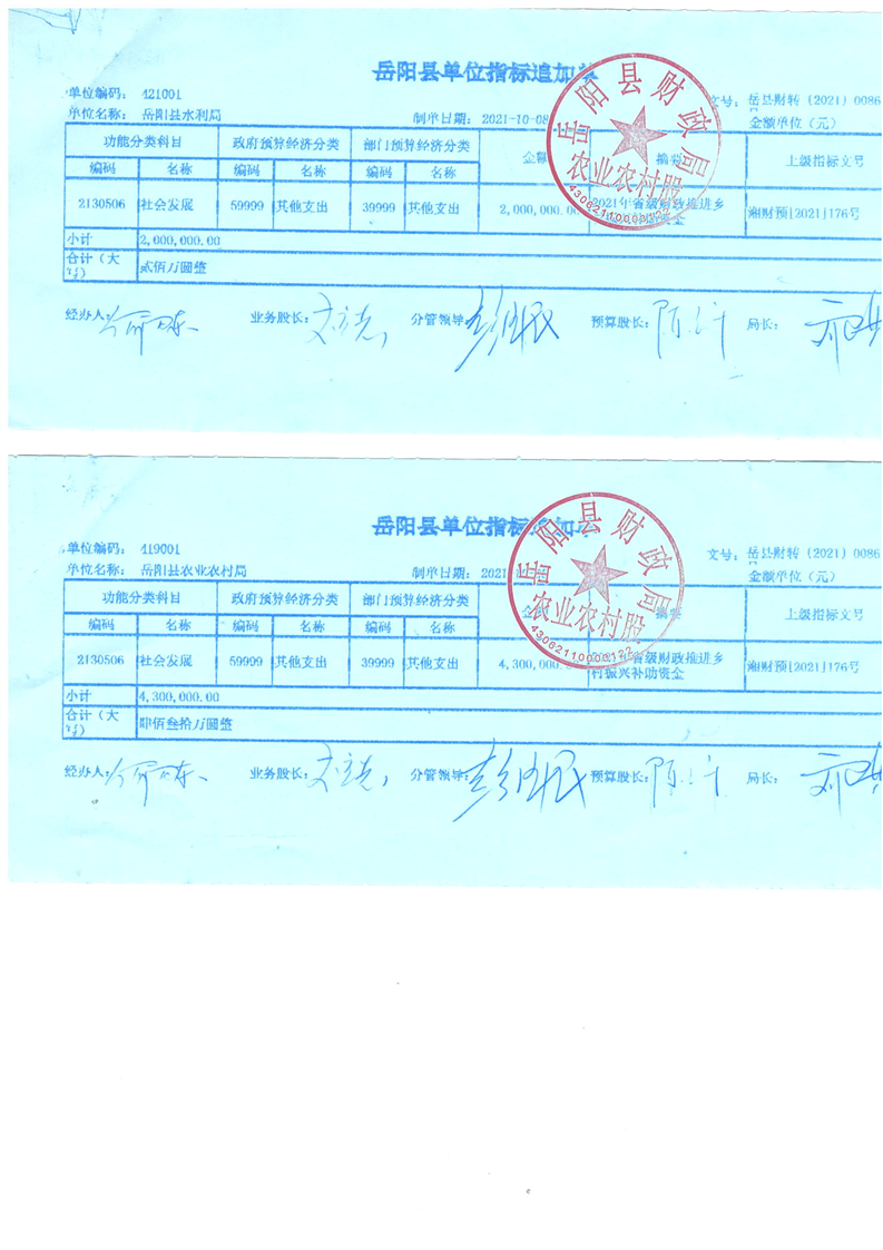 嶽陽縣下達2021年省級財政推進鄉村振興補助資金公開公示
