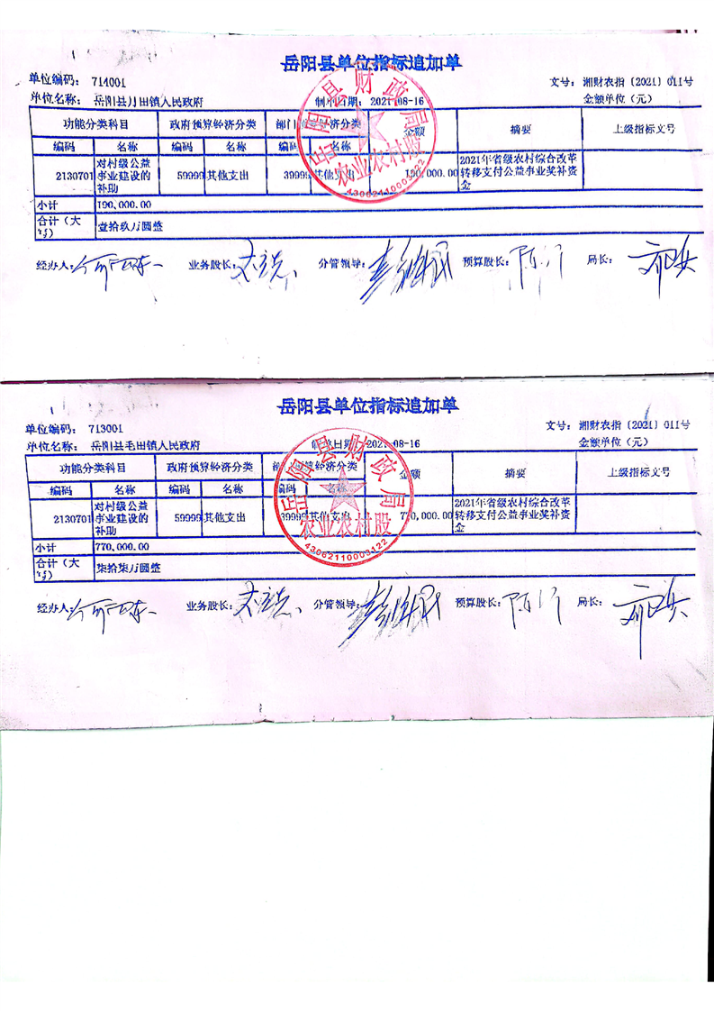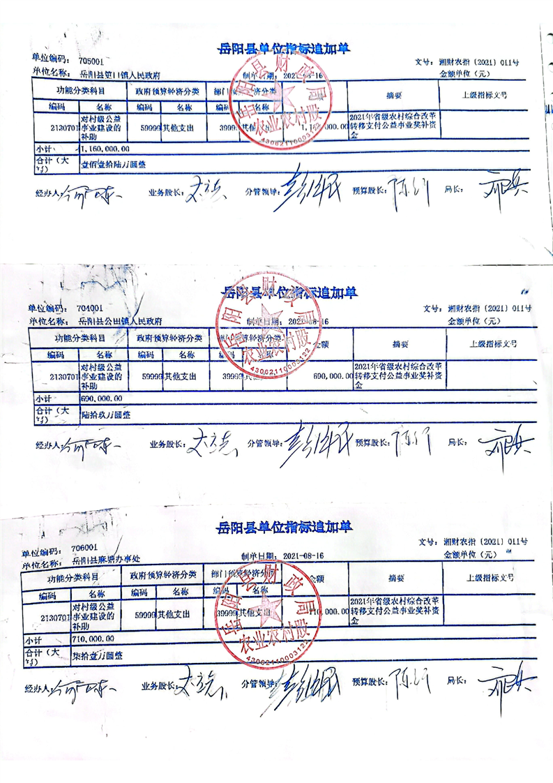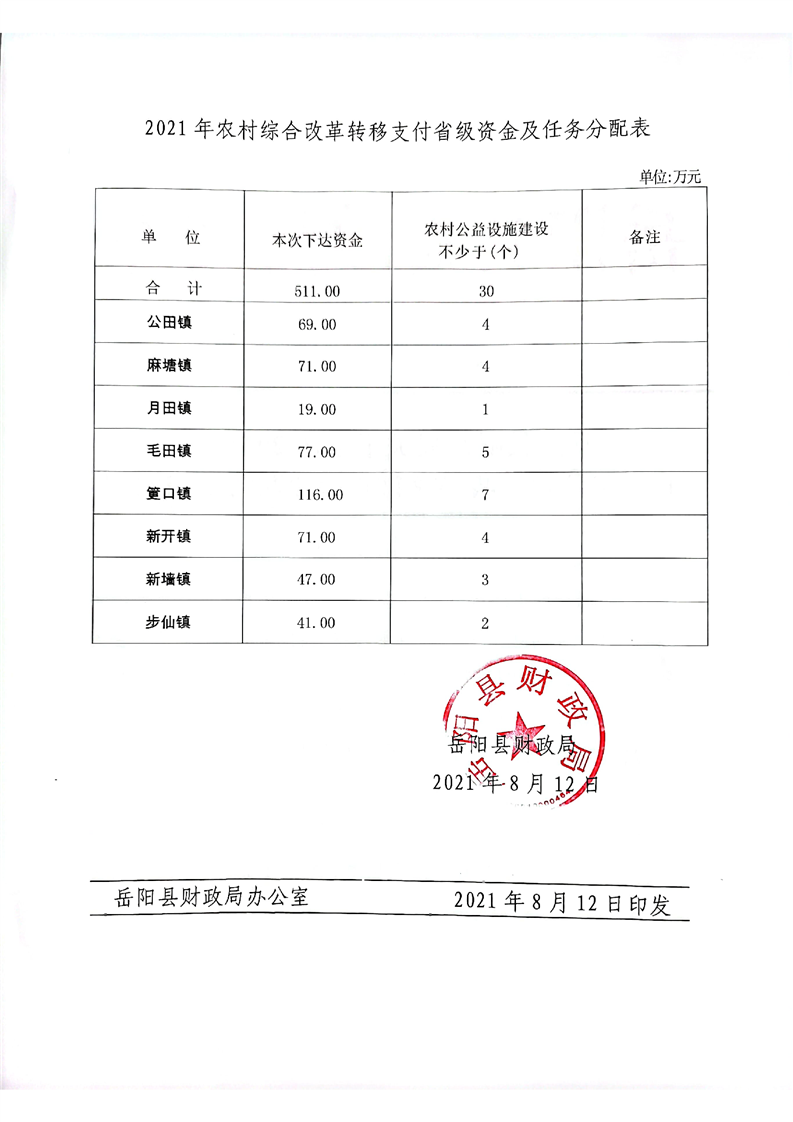 嶽陽縣財政局關於下達2021年農村綜合改革轉移支付省級補助資金的通知 嶽縣財發[2021]21號 511萬
