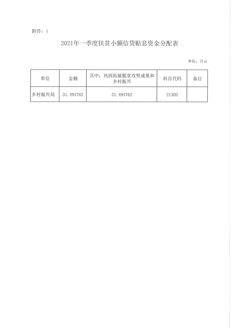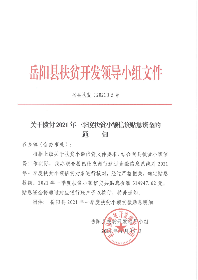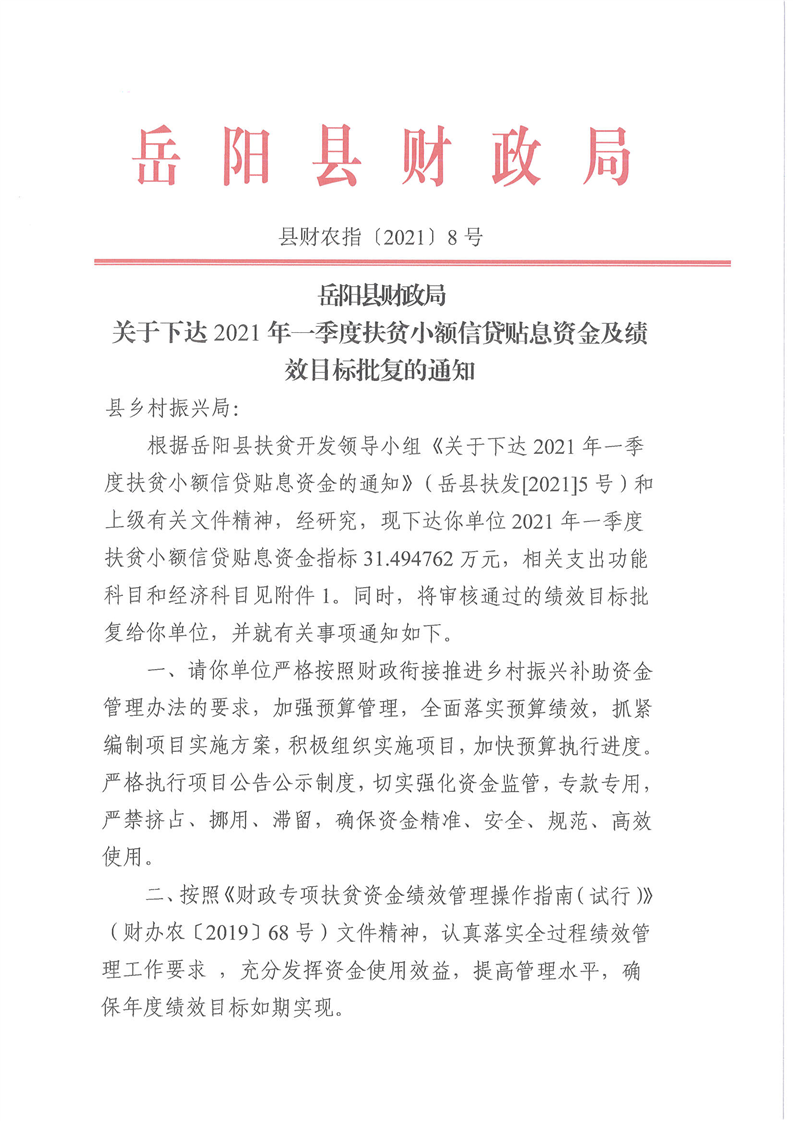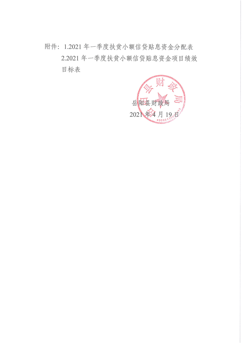 嶽陽縣財政局下達2021年一季度扶貧小額信貸貼息資金及績效目標批複的公開公示
