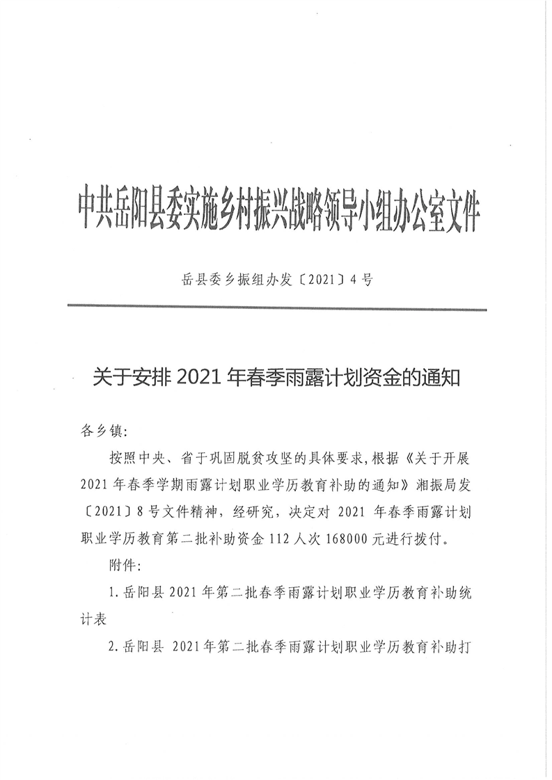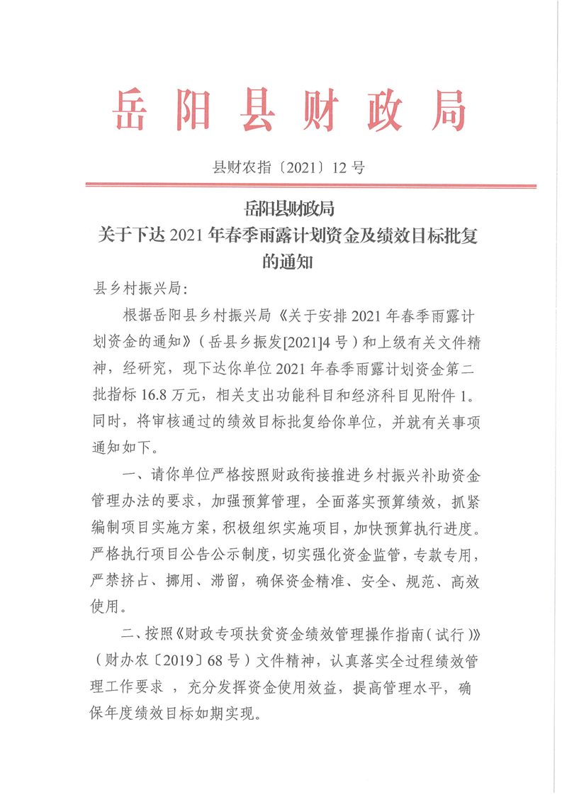 嶽陽縣財政局下達2021年春季雨露計劃資金餘額及績效目標批複的公開公示