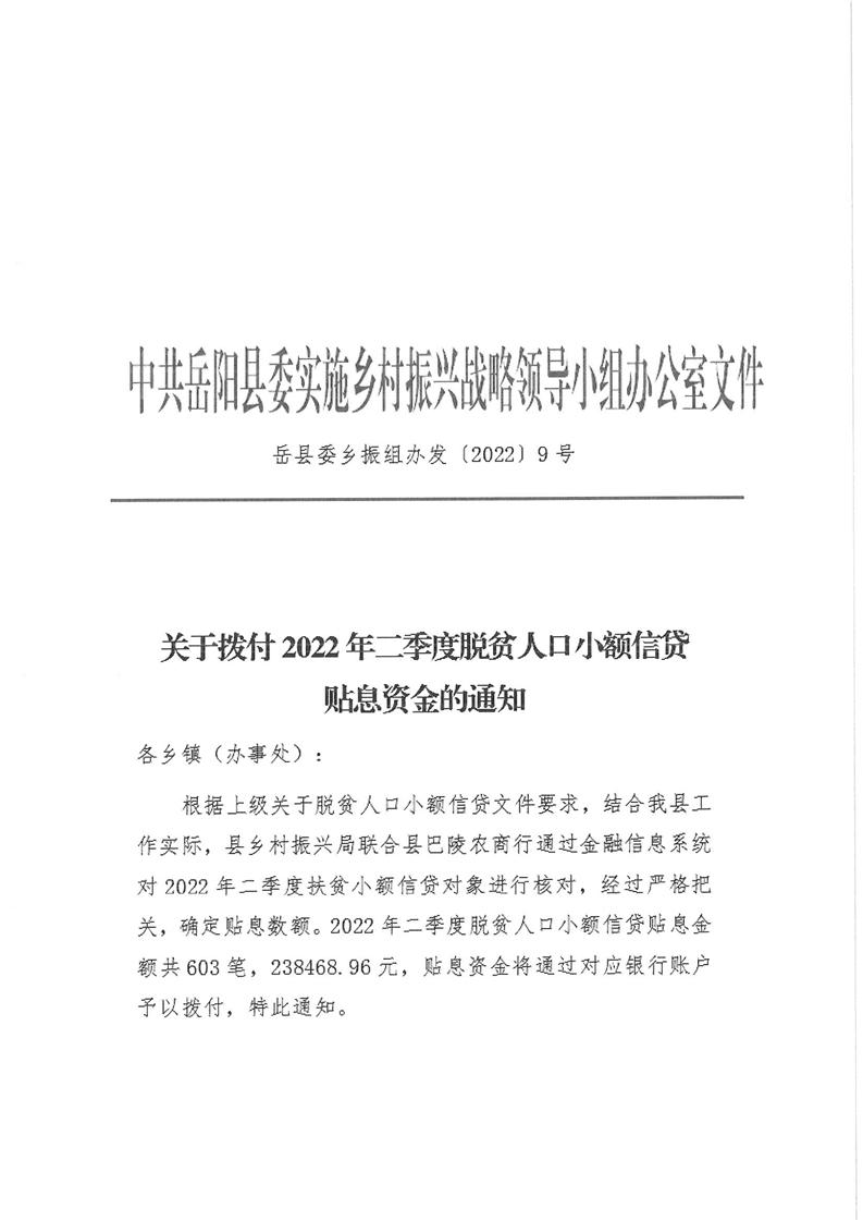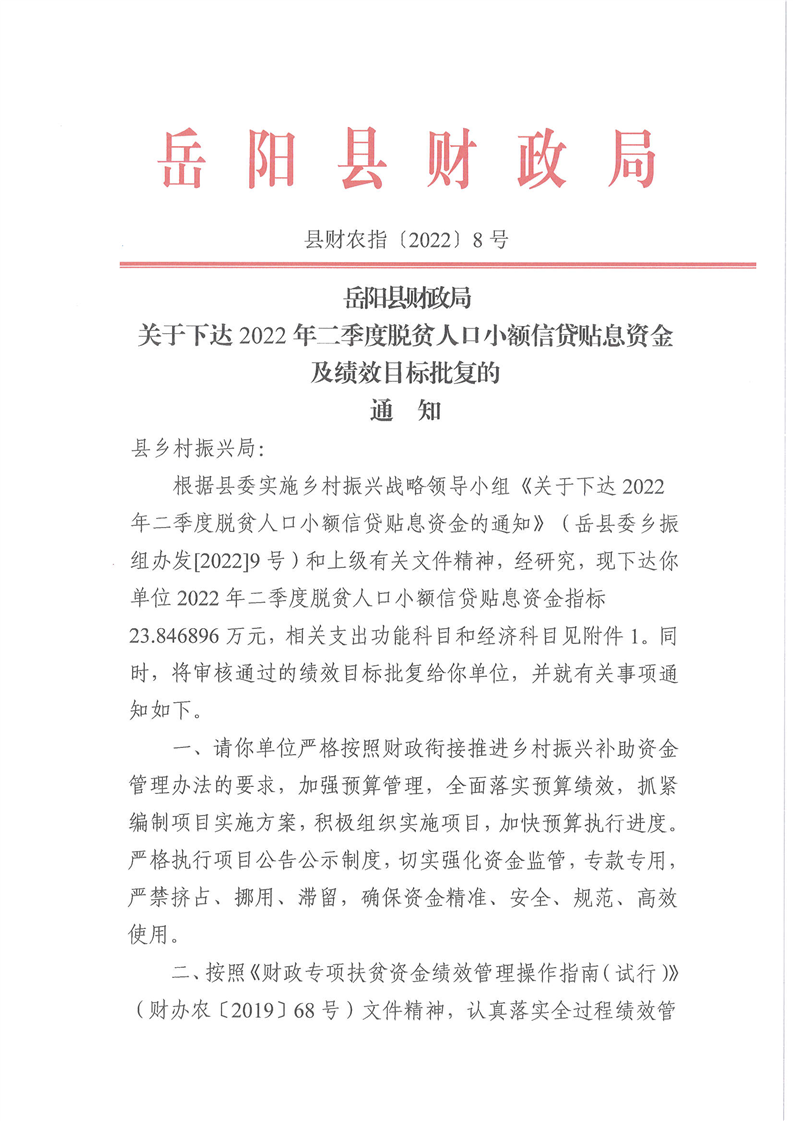 嶽陽縣財政局下達2022年二季度脫貧人口小額信貸貼息資金及績效目標批複的公開公示