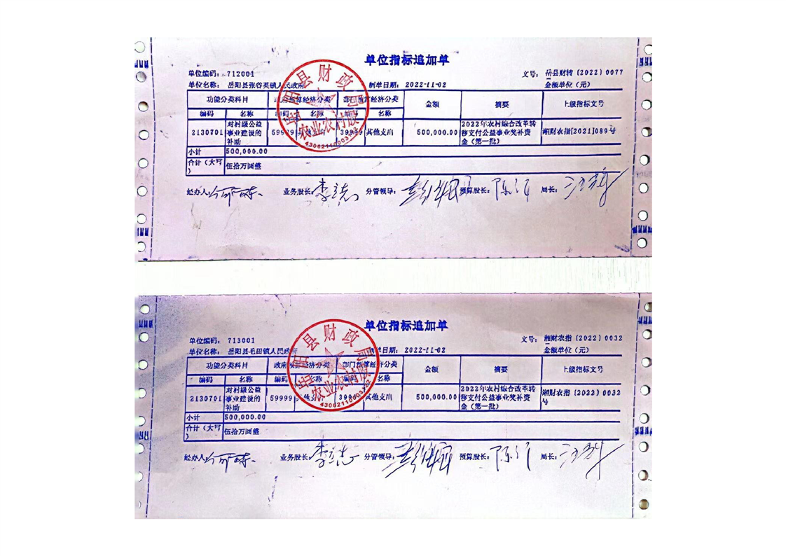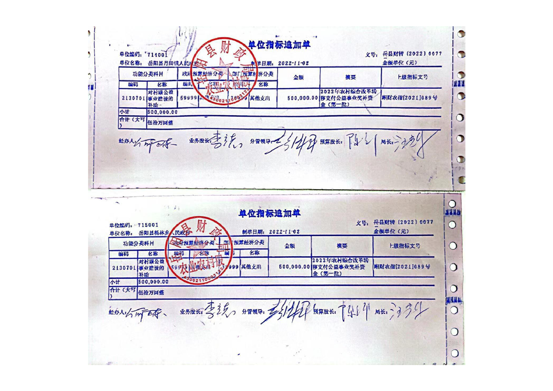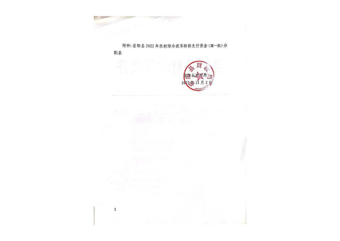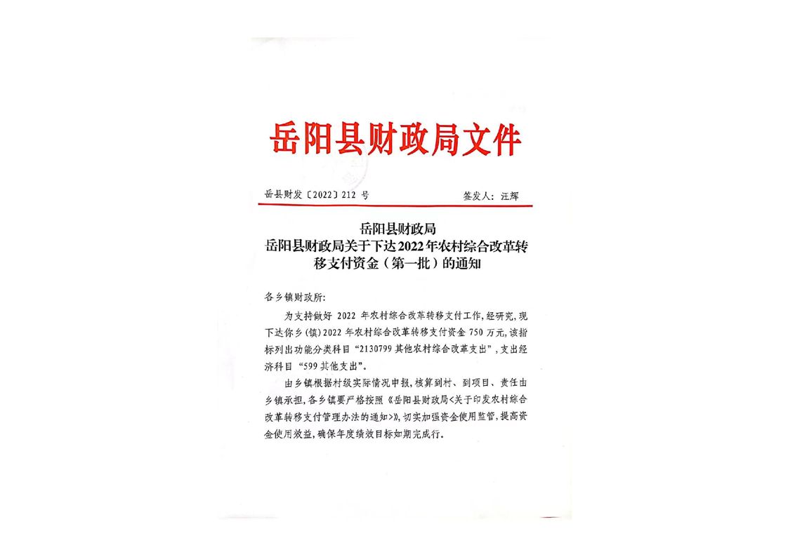 嶽陽縣財政局關於下達2022年農村綜合改革轉移支付資金(第一批)的通知(嶽縣財發〔2022〕212號)及資金撥付單