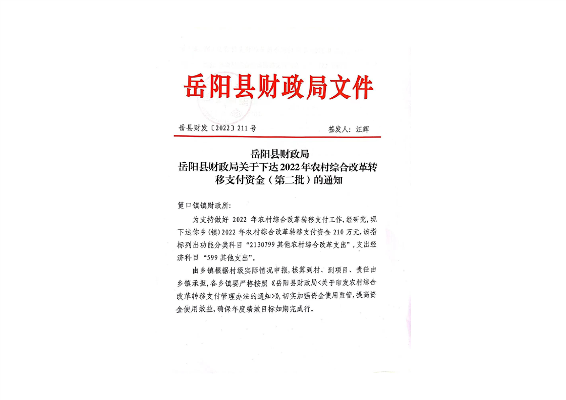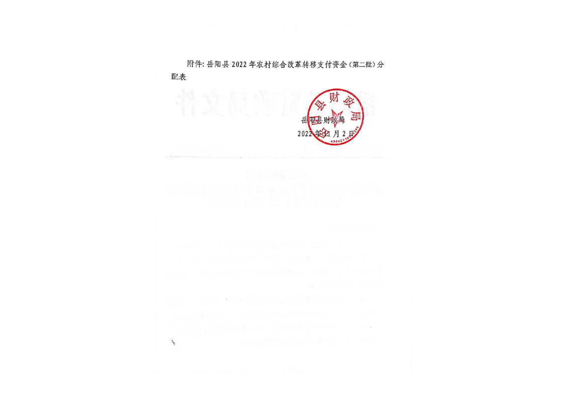 嶽陽縣財政局關於下達2022年農村綜合改革轉移支付資金(第二批)的通知(嶽縣財發〔2022〕211號)及資金撥付單
