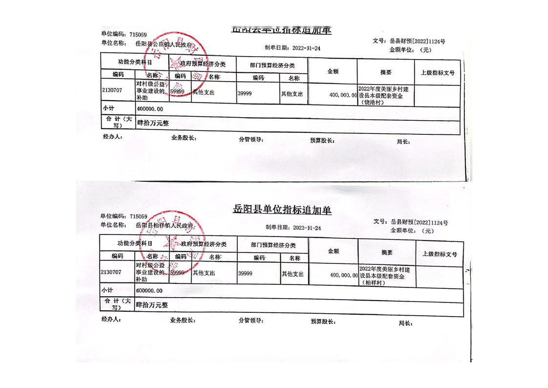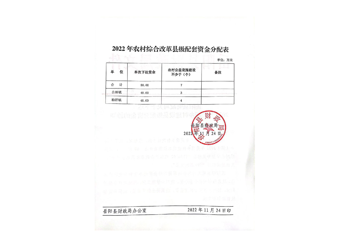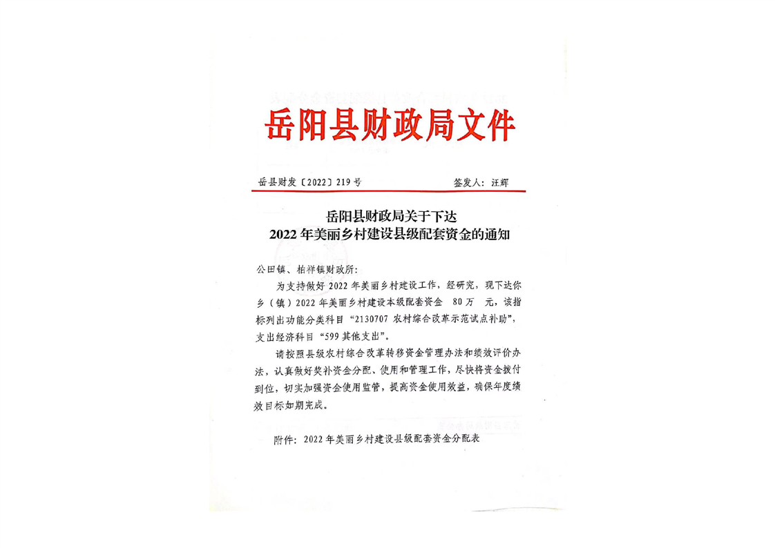 嶽陽縣財政局關於下達2022年美麗鄉村建設縣級配套資金的通知(嶽縣財發〔2022〕219號)及資金撥付單