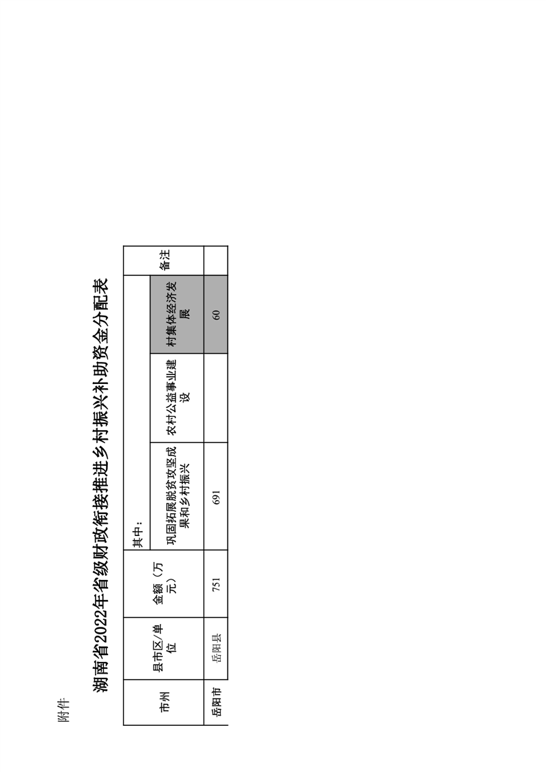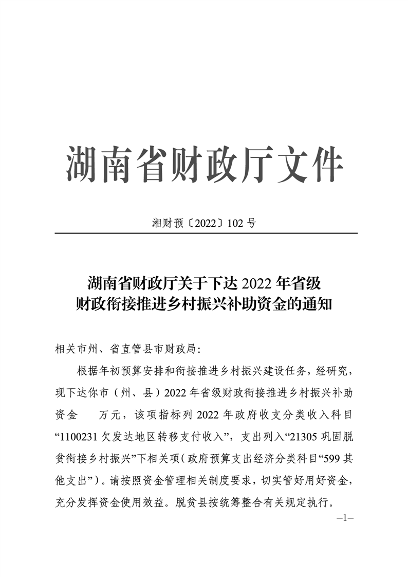 湖南省財政廳關於下達2022年省級財政銜接推進鄉村振興補助資金的通知(湘財預〔2022〕102號)