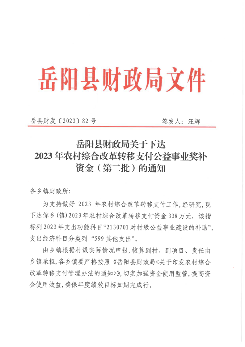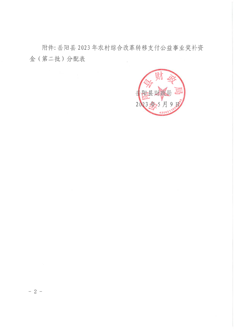 82號嶽陽縣財政局關於下達2023年農村綜合改革轉移支付資金(第二批)的通知