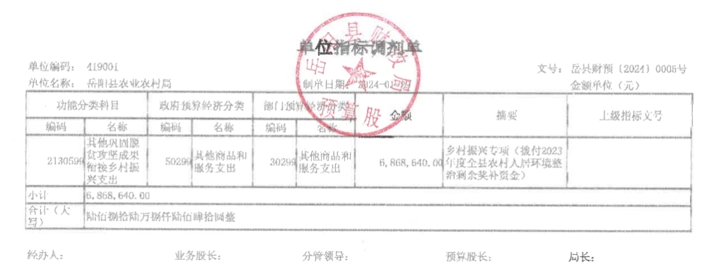 關於撥付2023年度全縣農村人居環境整治剩餘獎補資金的請示及資金撥付單