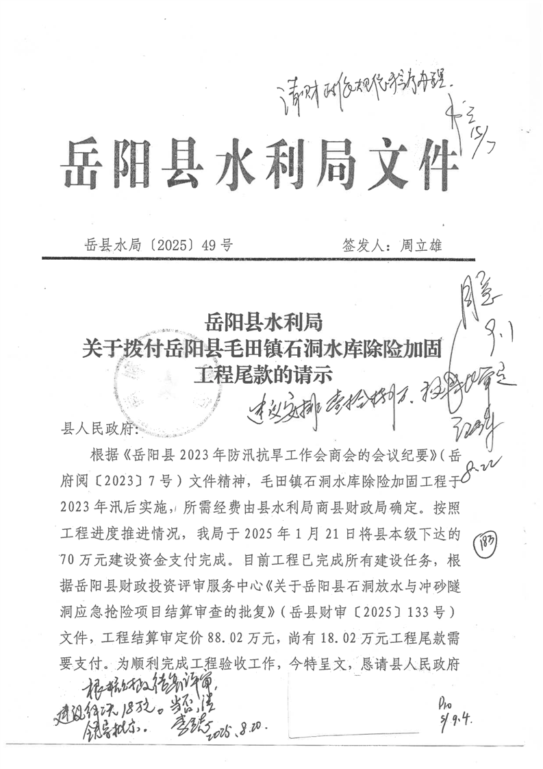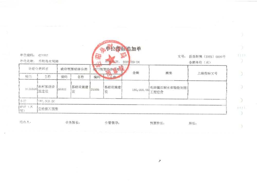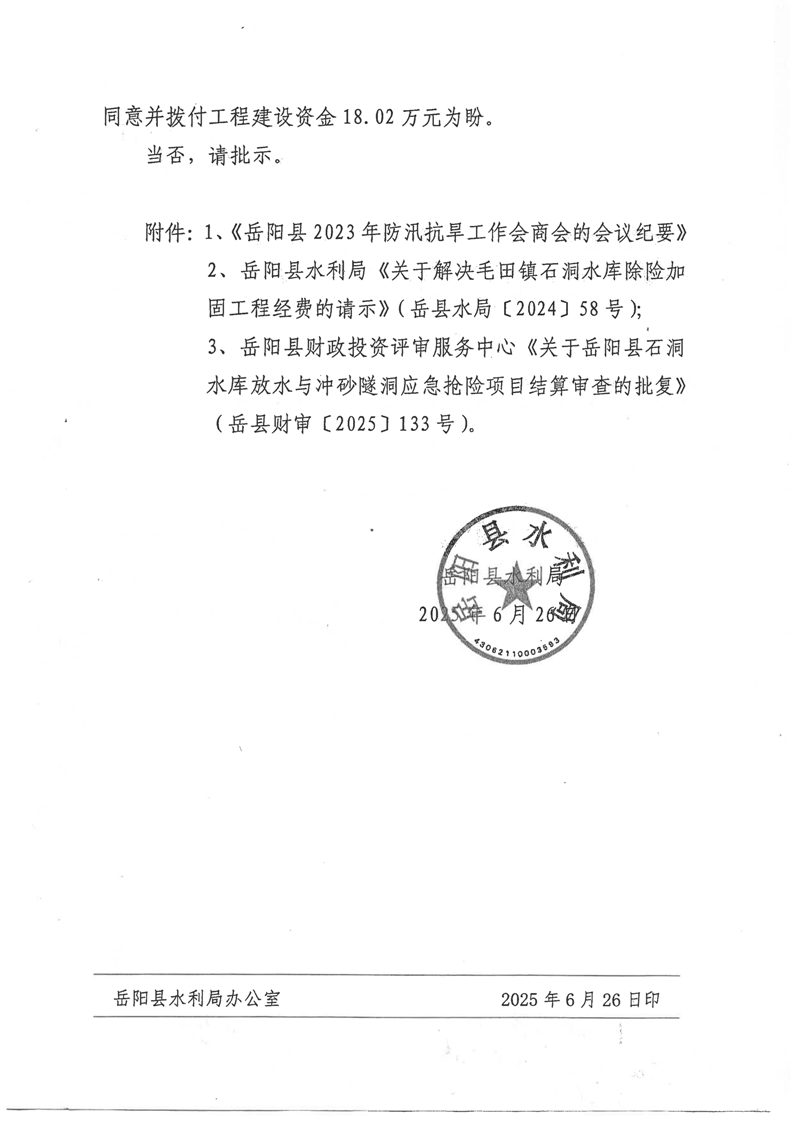 嶽陽縣毛田鎮石洞水庫除險加固工程資金