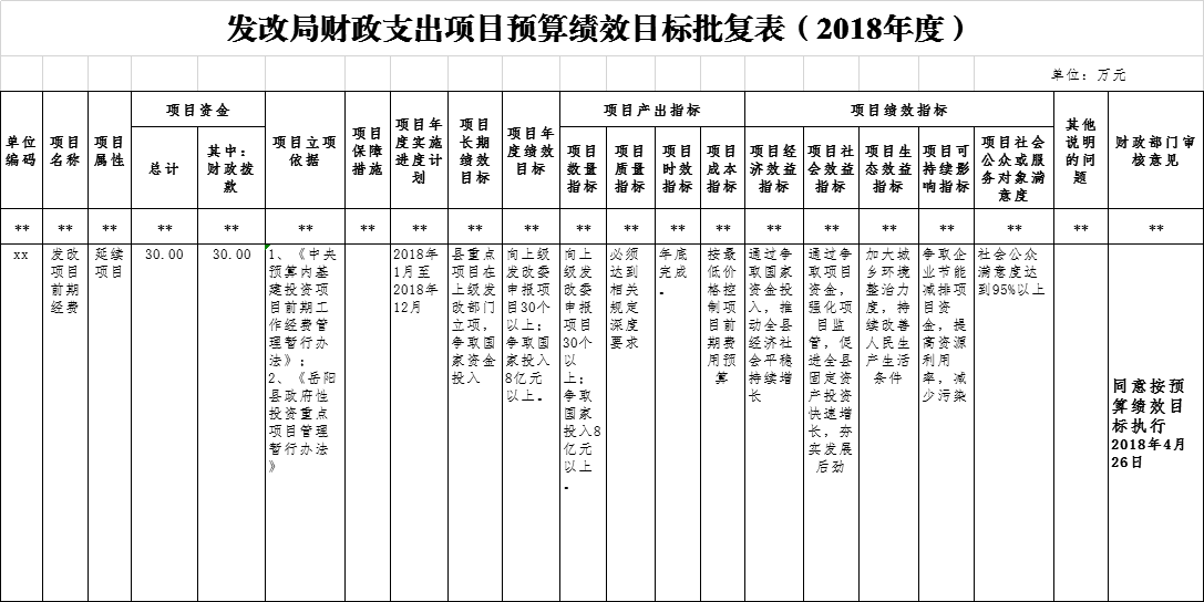 發改局財政支出項目預算績效目標批複表(2018年度)