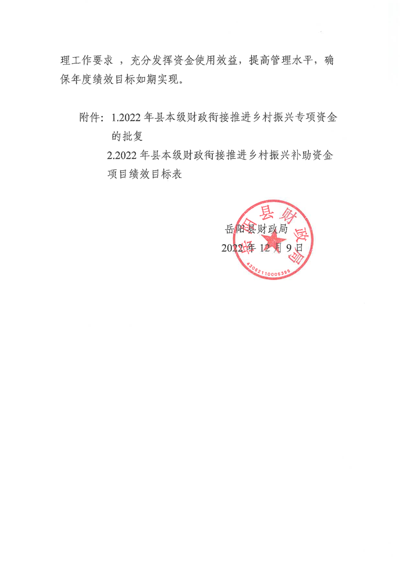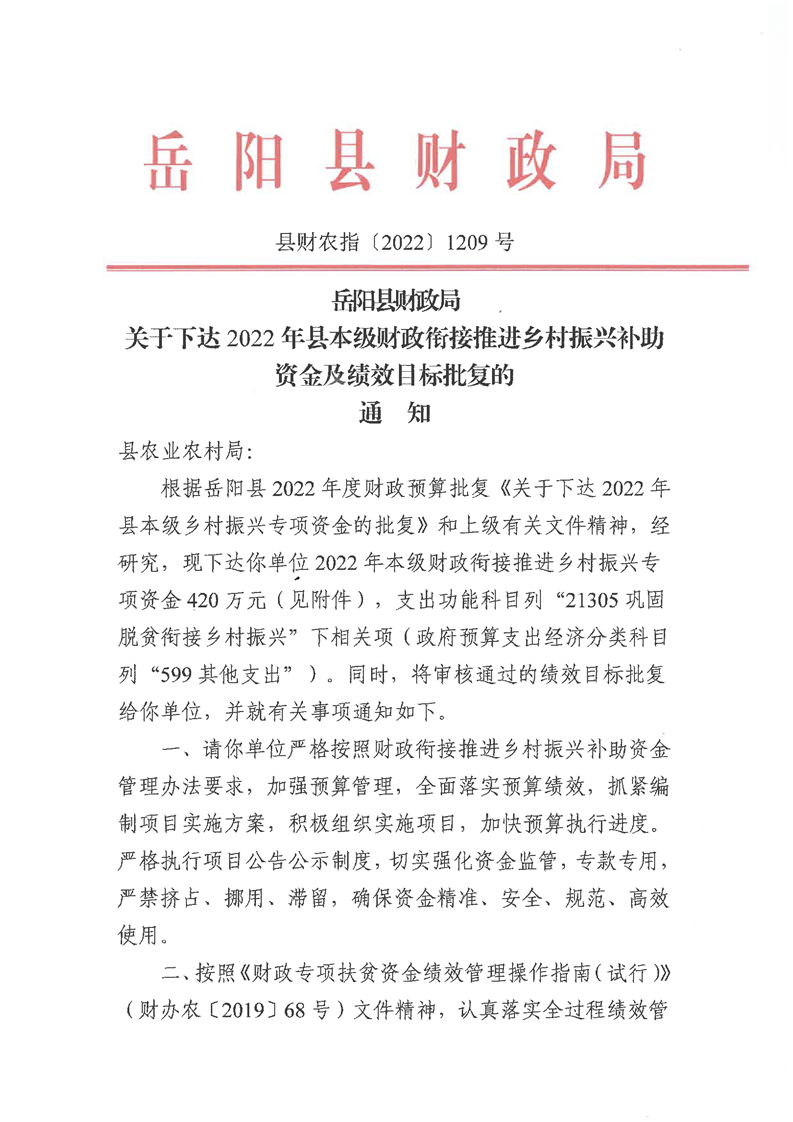 嶽陽縣財政局關於下達2022年縣本級財政銜接推進鄉村振興補助資金及績效目標批複(農業局420)公開公示