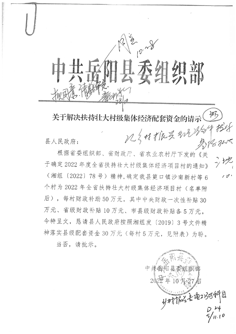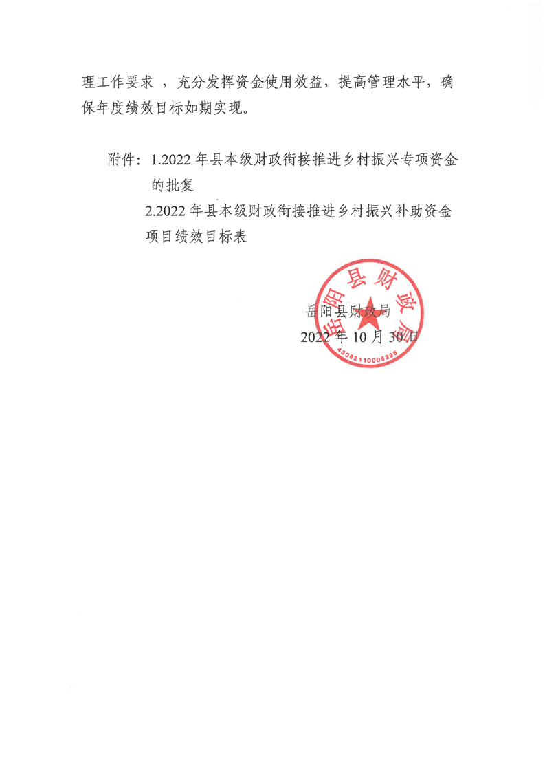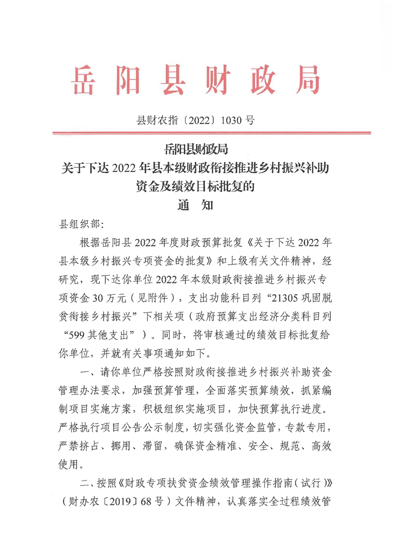 嶽陽縣財政局關於下達2022年縣本級財政銜接推進鄉村振興補助資金及績效目標批複(組織部30萬)公開公示