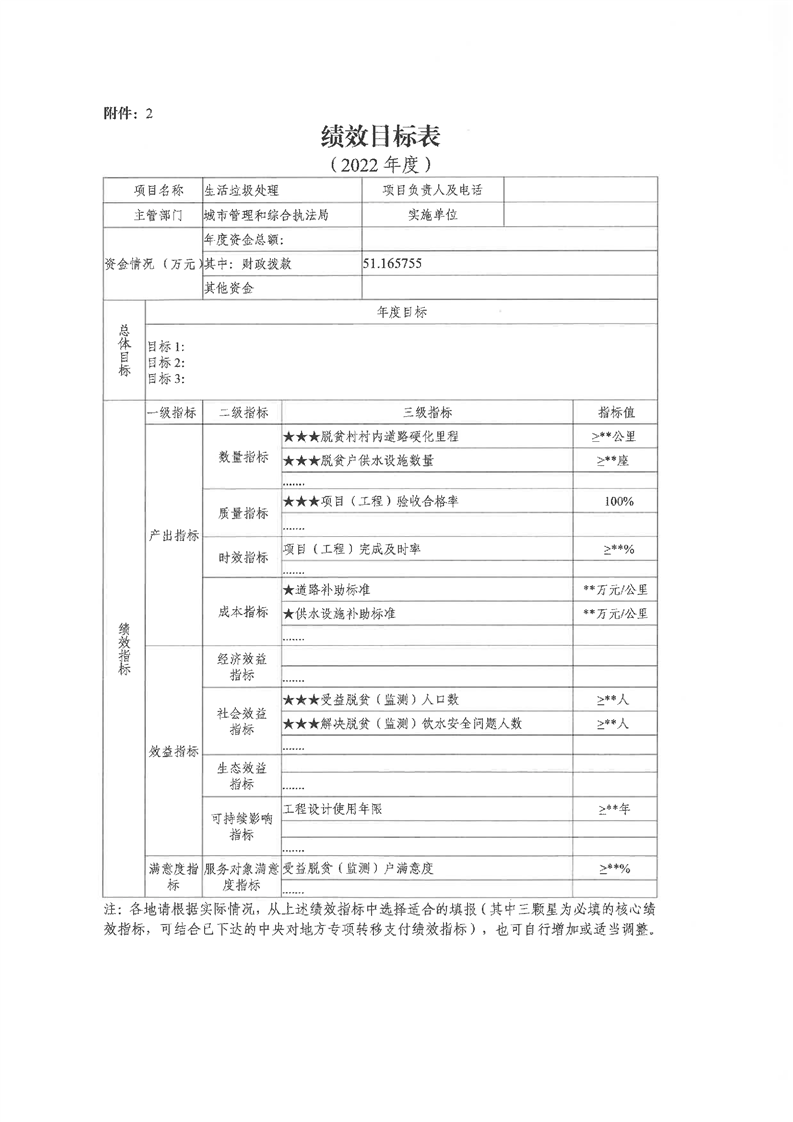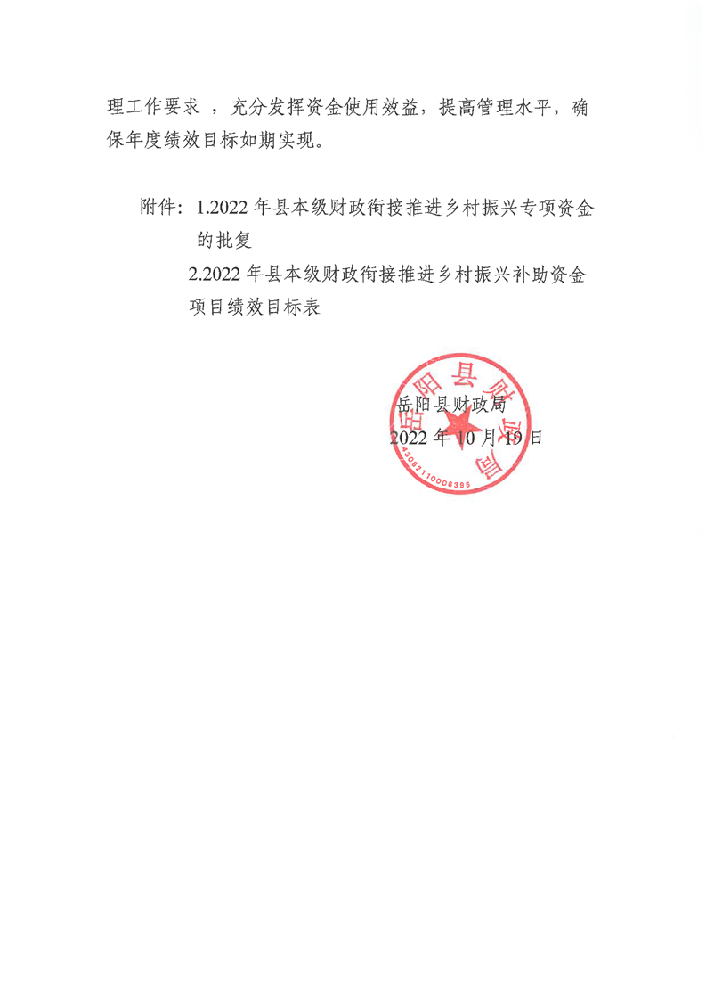 嶽陽縣財政局關於下達2022年縣本級財政銜接推進鄉村振興補助資金及績效目標批複(城管局51.16)公開公示