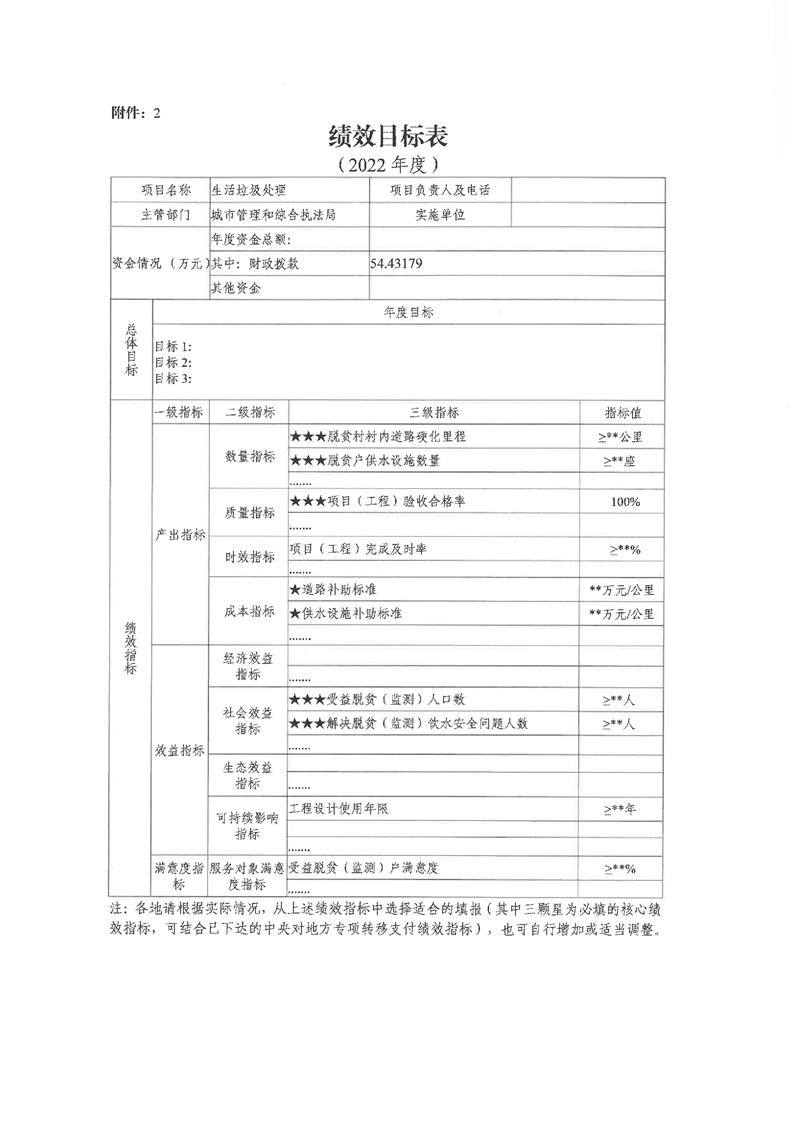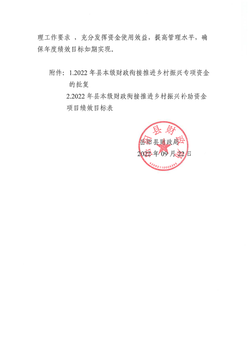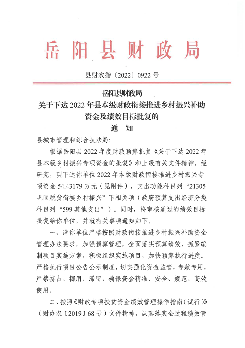 嶽陽縣財政局關於下達2022年縣本級財政銜接推進鄉村振興補助資金及績效目標批複(城管局54.43萬)公開公示